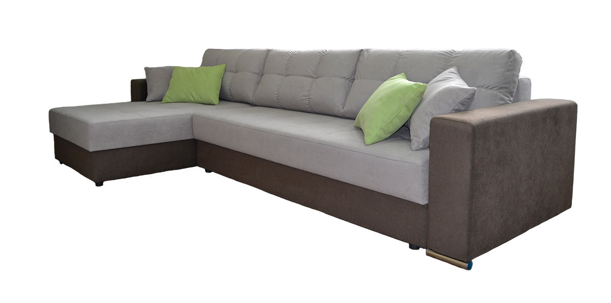 Диван-кровать угловой «Сан-Грегори» отличается интересным и современным дизайном. Вставка из ткани или кожзама в торце подлокотника дивана придает некоторый шарм и особую индивидуальность. Угол дивана может быть как правосторонним, так и левосторонним.