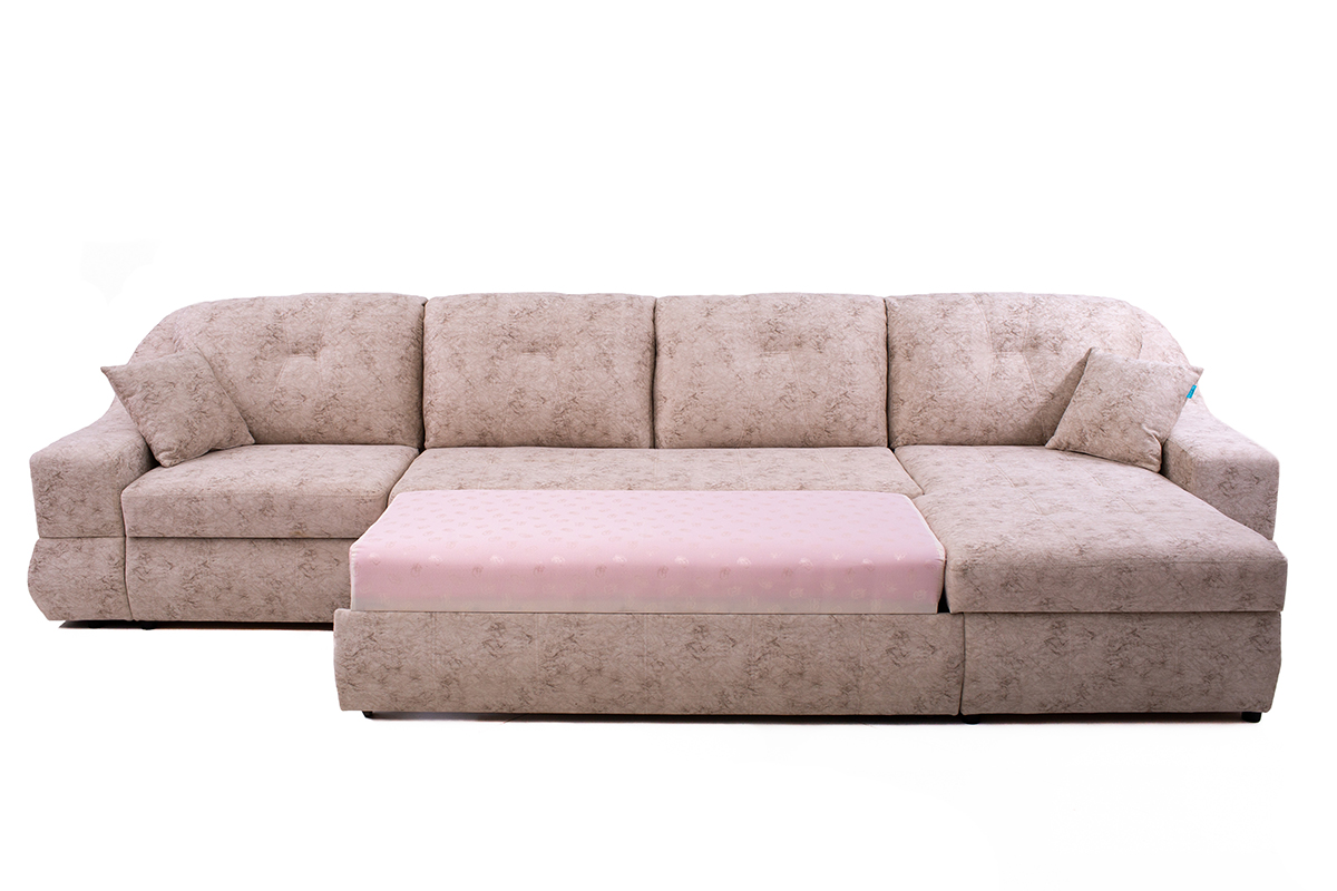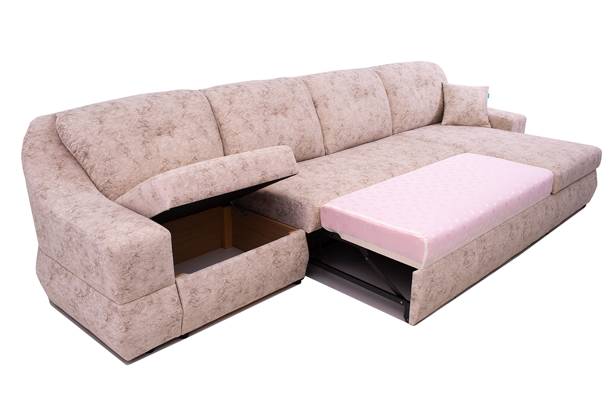 Самый популярный механизм из-за всеобщей моды на угловые диваны. Хорошо зарекомендовал себя по соотношению «цена — качество». Часть спального места находится под сиденьем , выдвигаем — получаем огромную кровать.