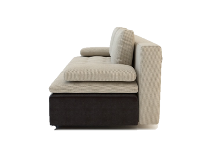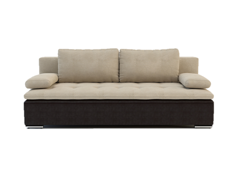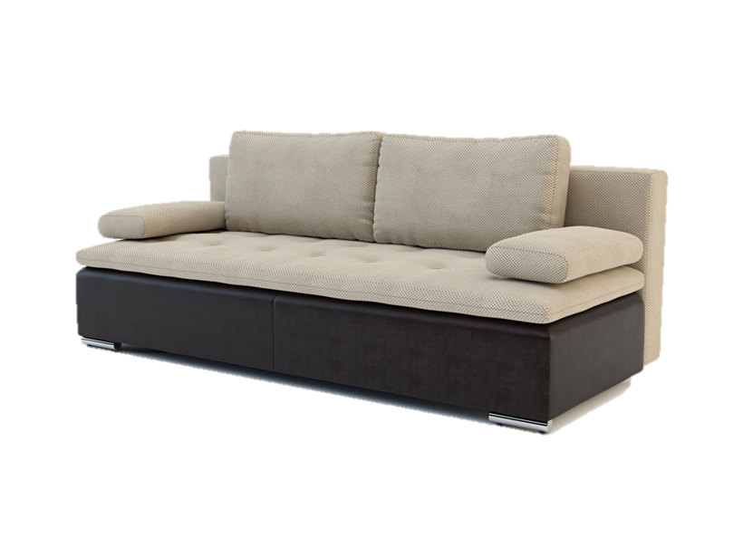 Современный диван с накладными валиками-подлокотниками и двумя широкими подушками на прямоугольную спинку, сиденье в виде легкого мягкого мата в светлой обивке из рогожки. Основание обито полуглянцевой темной экокожей. Диван укомплектован ящиком для белья. Несколько вариантов расцветки в ассортименте, где можно выбрать цветовую комбинацию обшивки по душе.