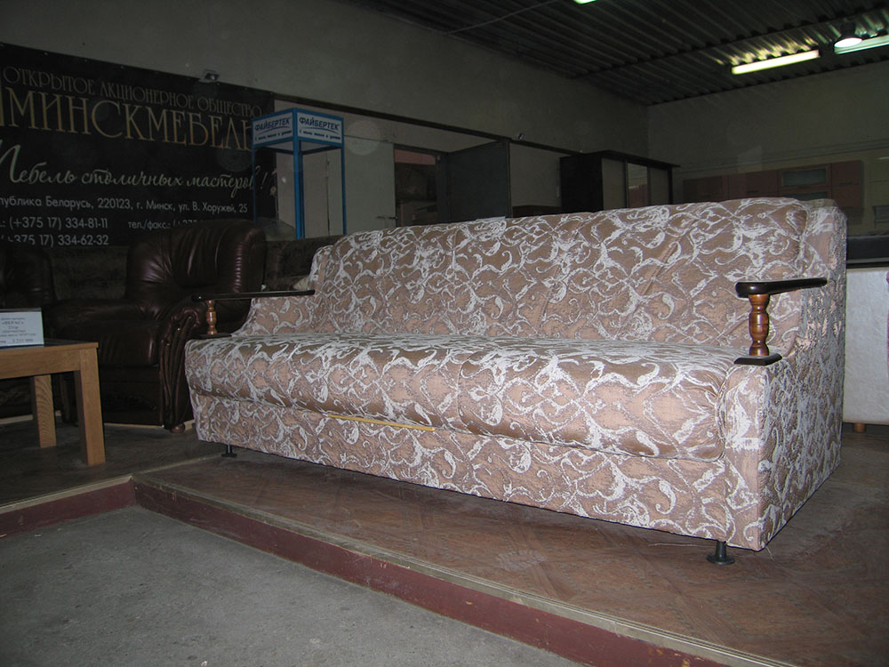 Диван-кровать «Верас» с легкостью впишется в классический интерьер. Обивка дивана украшена повторяющимся цветочным узором. Со светлым оттенком обивки удачно контрастируют жесткие подлокотники черного цвета.