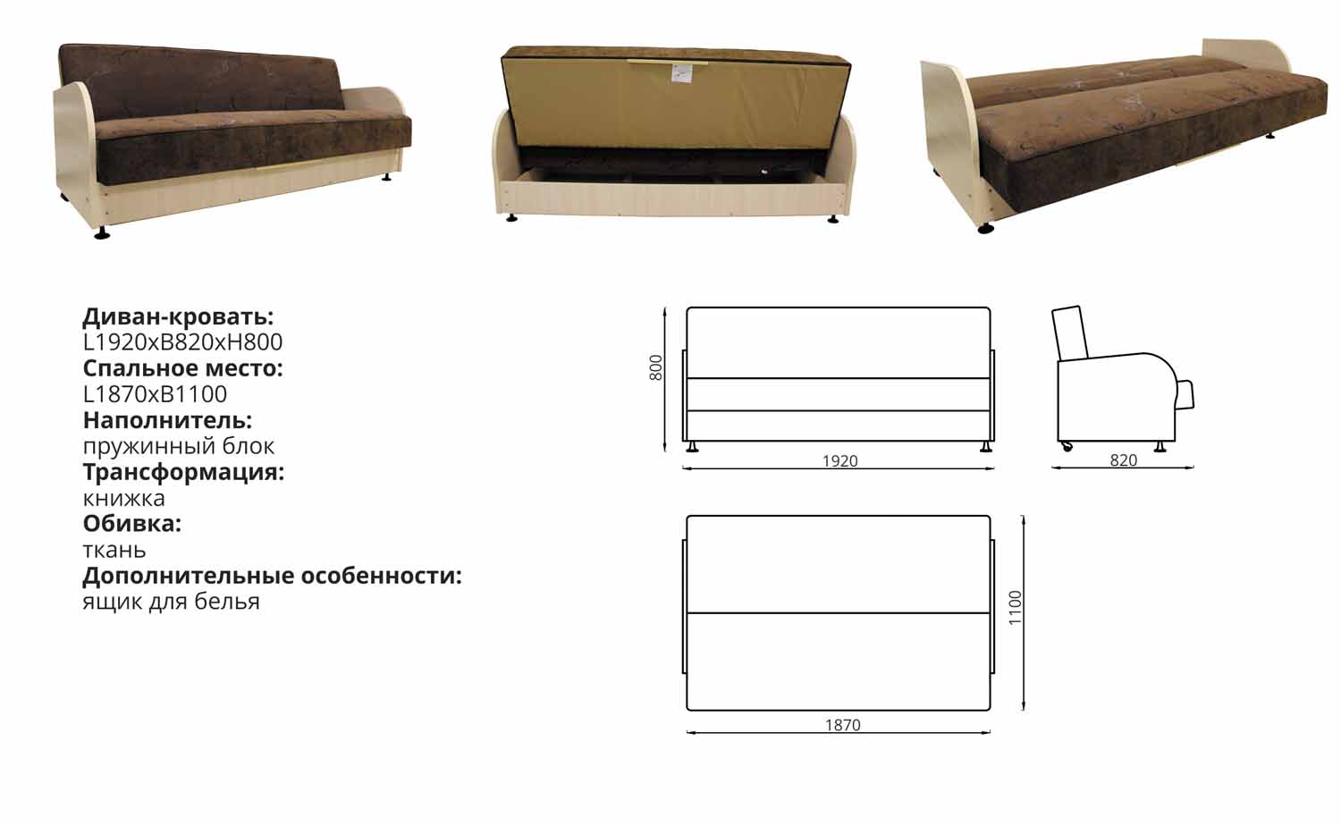 Диван-кровать «Явор» оборудован вместительной нишей для белья, механизм трансформации – книжка. Данная модель отлично впишется в классический интерьер. Обивкой служит ткань, цвет вы можете выбрать самостоятельно.