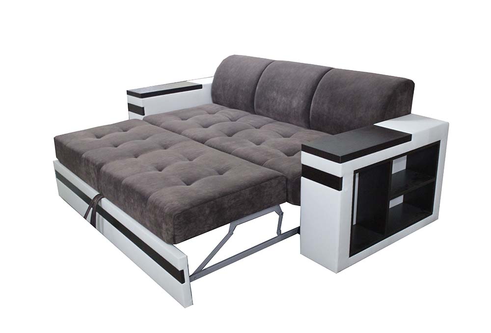 Стильный и функциональный угловой диван с полками в подлокотниках