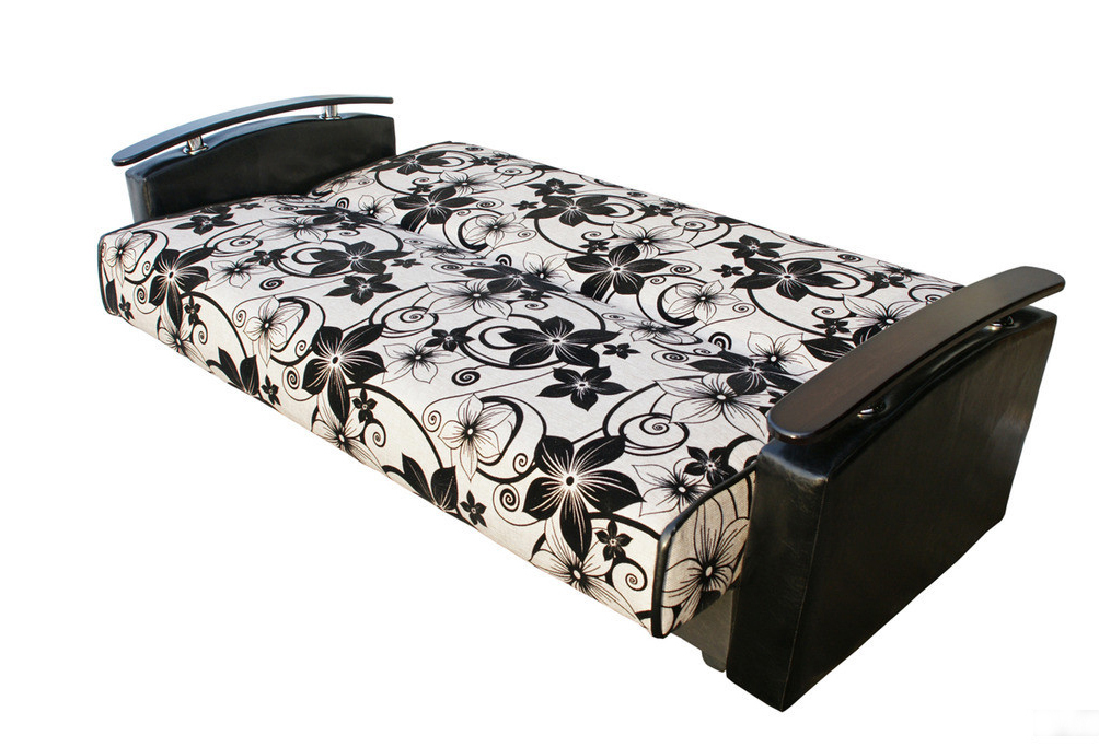 Конструкция дивана «Лидер» оснащена простым и надежным механизмом раскладки типа «книжка». Корпус дивана выполнен в черном цвете. Подлокотники украшены плавными деревянными элементами. Обивка исполнена из светлого велюра с цветочным узором.
