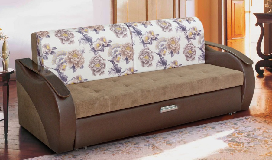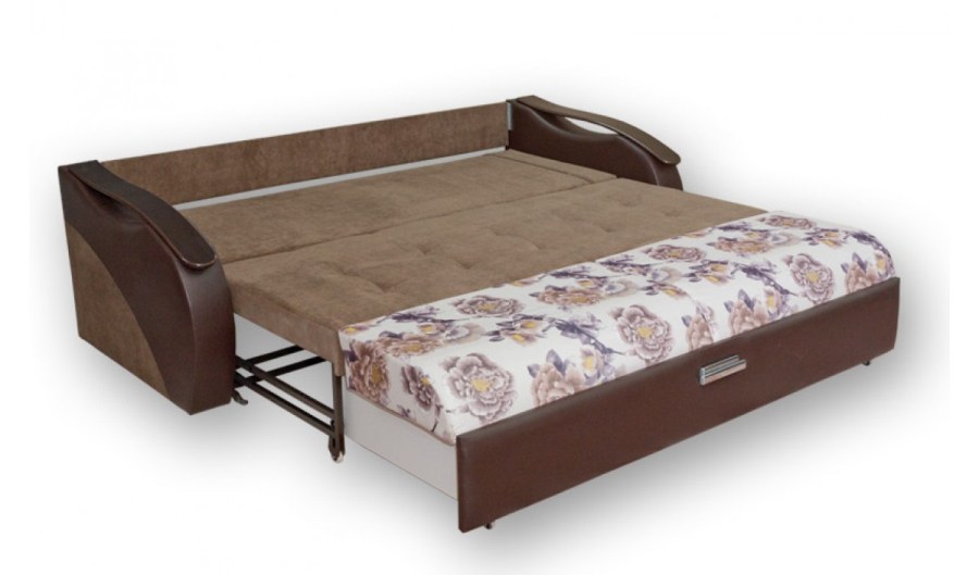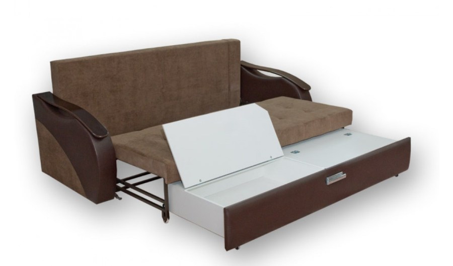Ящики в подлокотниках и столик. Настил: ортопедические латы + ППУ.