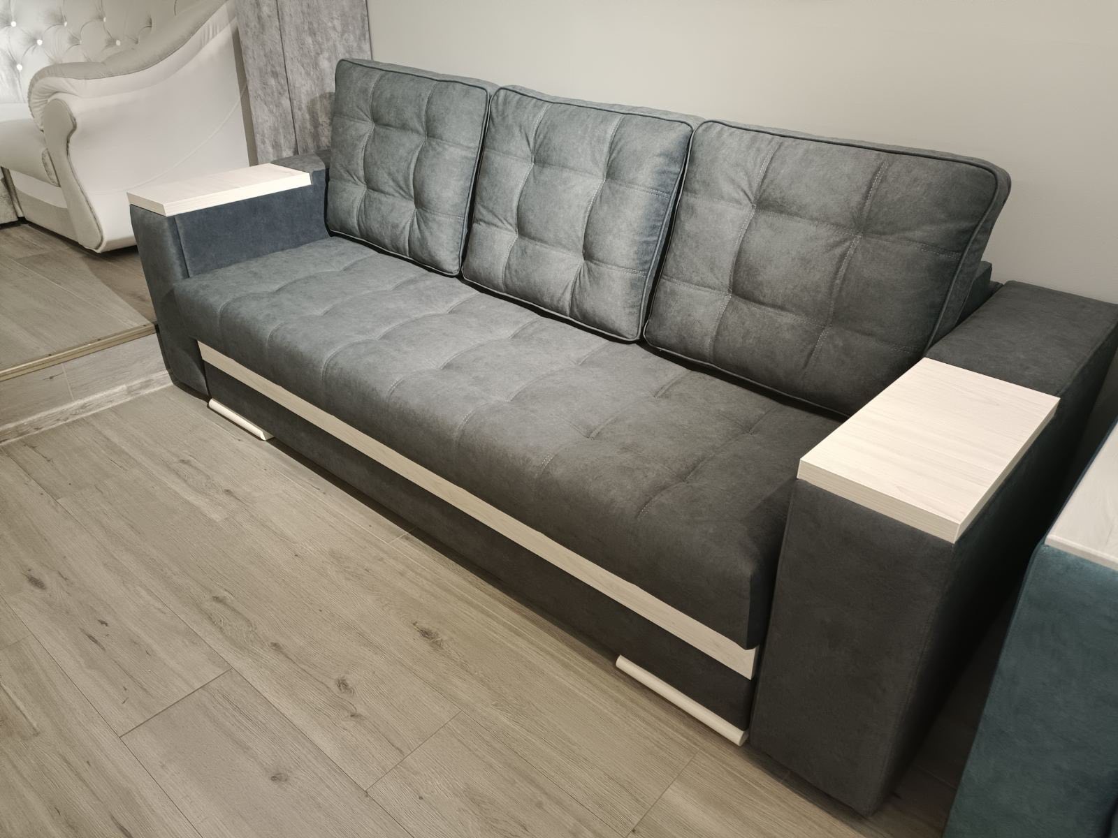 Удобный современный диван в гостиную. Накладки на подлокотниках. Спинка-подушки.
