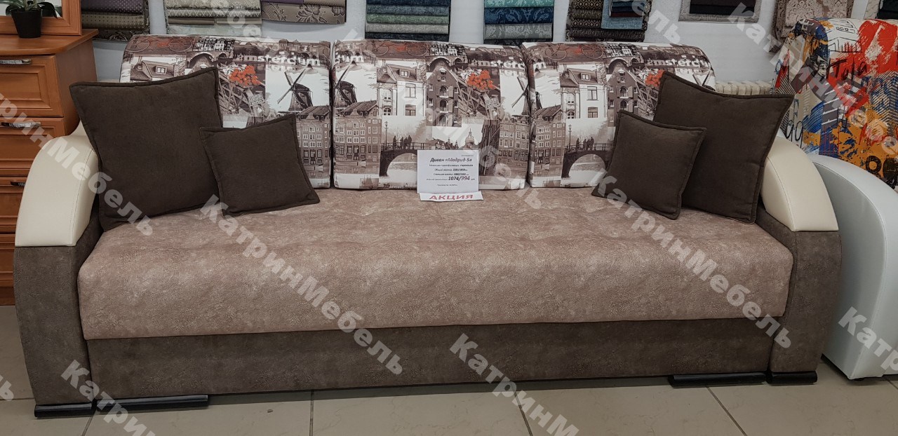 Подушки: диван декорируют три большие подушки с фотопринтом и четыре поменьше тёмного коричневого цвета, которые придают уют и разнообразие текстур.