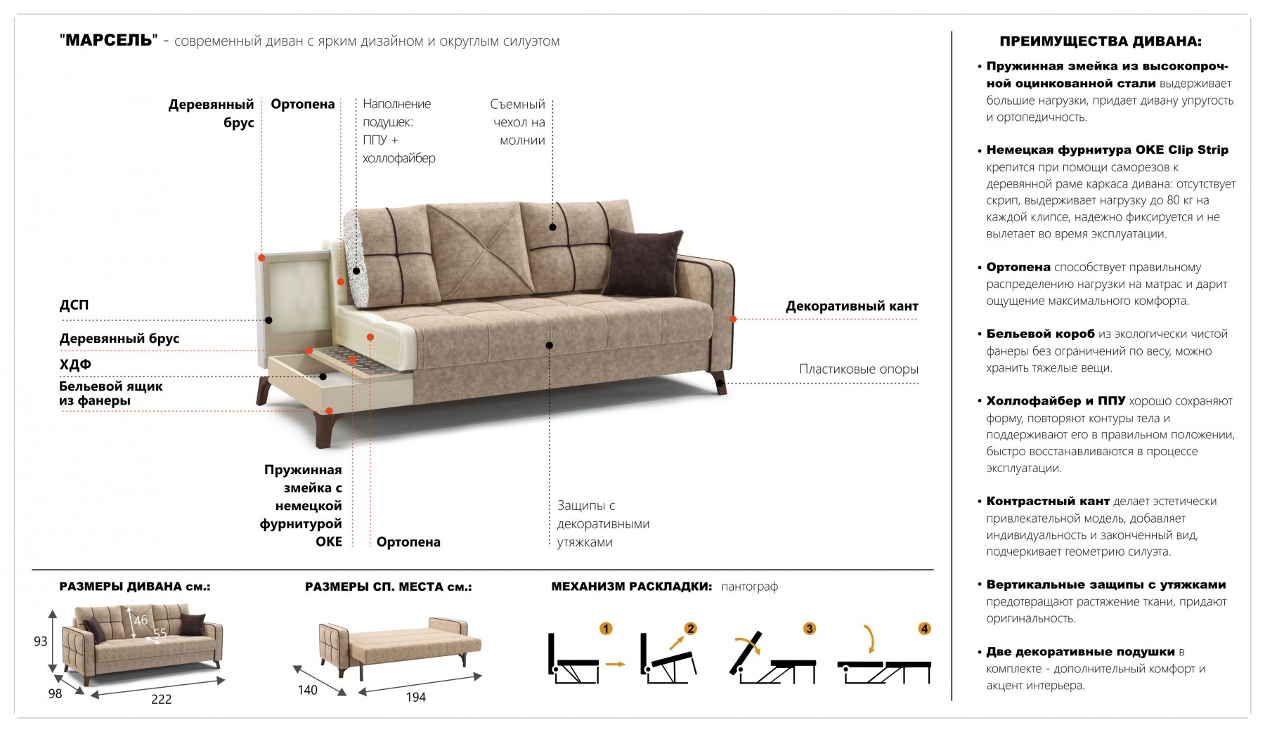 Габариты: 235х107х96 см. Механизм: Пума. Наполнитель: Пружинный блок "Змейка", Высокоэластичный ППУ.