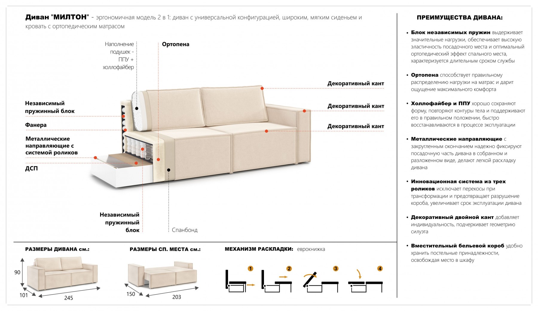 В разложенном виде представляет удобную 2-х спальную кровать. Механизм трансформации: дельфин.