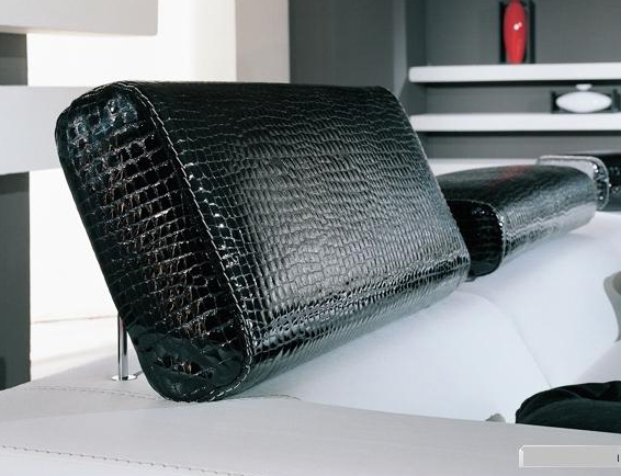Диван декорирован валиками и небольшими мягкими подушками квадратной формы.