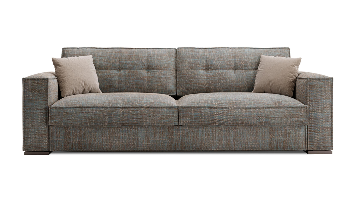 Окантовка в виде защипов в сочетании с пухлыми подушками спинки и сиденья придала дивану эффект визуального комфорта и традиционной надежности.