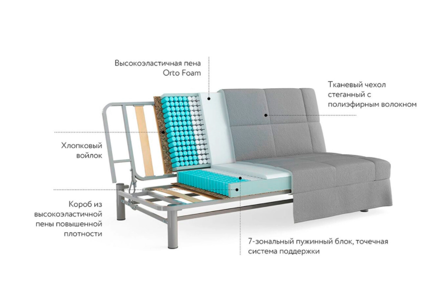 Компактный анатомический диван с надежным механизмом трансформации "Клик-кляк". Глубокая посадка позволит днем уютно устроиться с книгой или планшетом, а ночью высокий 7-ми зональный матрас физиологически правильно поддержит позвоночник. Модель без подлокотников позволяет экономить пространство в комнате, не экономя на комфортном сне!
