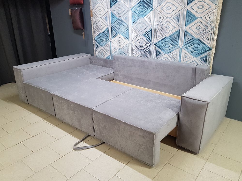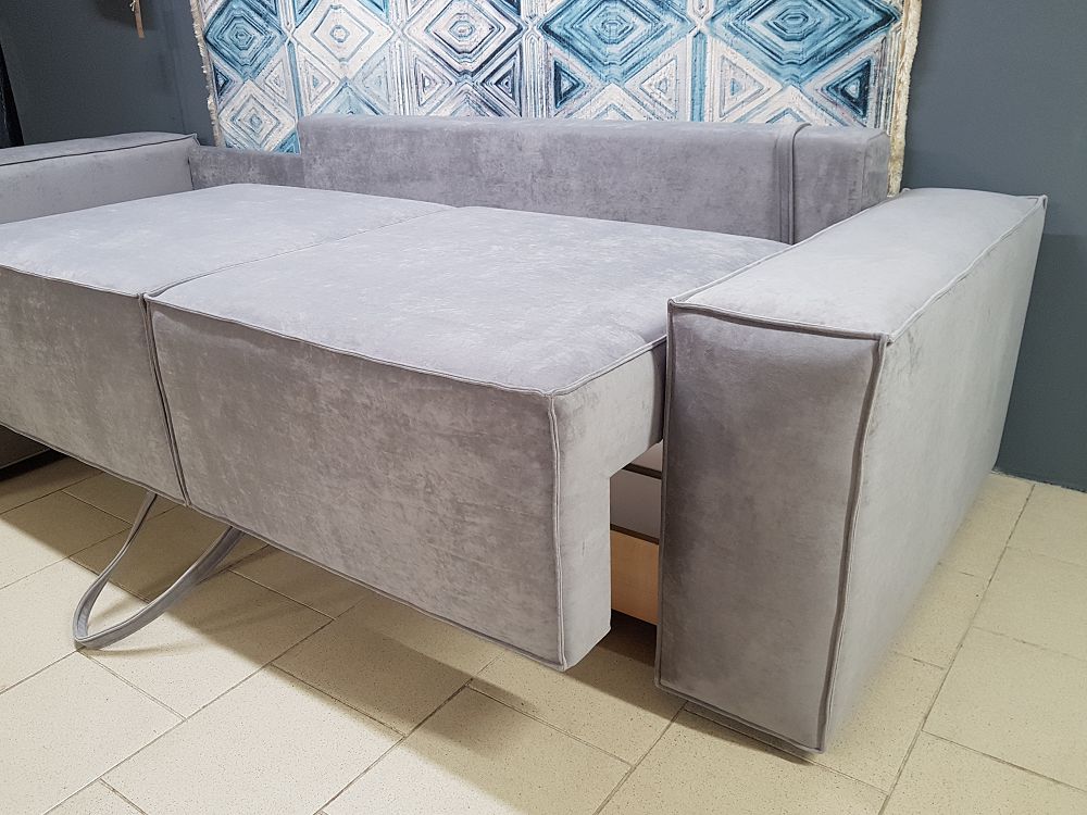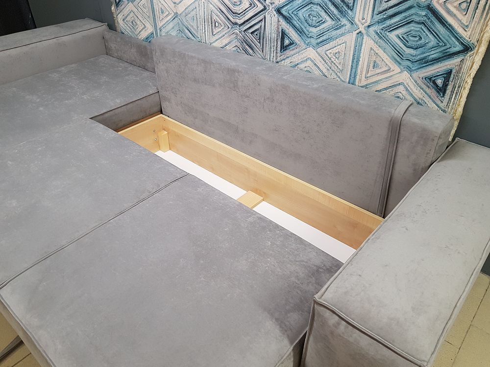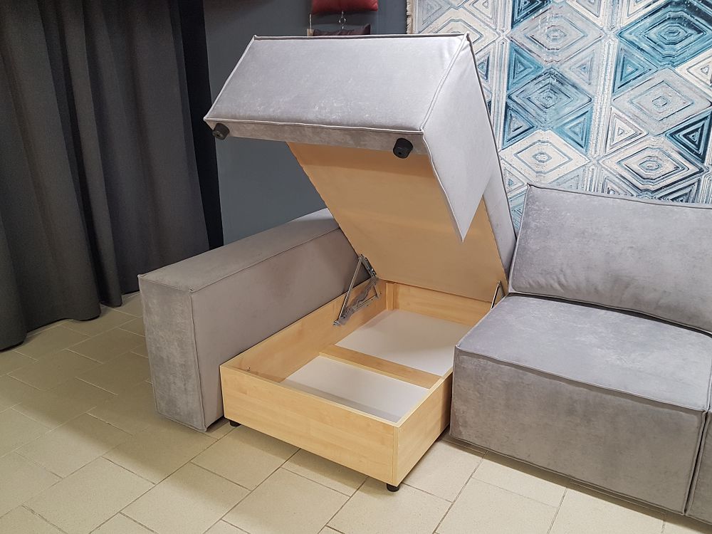 Диван оснащен легким механизмом раскладки и бельевым ящиком.