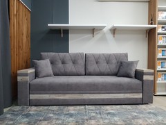 Прямой современный раскладной диван в квадратной стяжке сиденья и подушек спинки. В широких прямоугольных боковинах обустроены ниши с открывающимися крышками, которые могут быть использованы, в том числе, в качестве мини-баров.