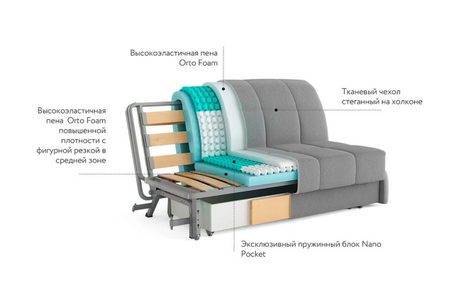 В основе дивана – высокий матрас, уникальный для такого вида трансформации. 7-зональный пружинный блок NanoPocket поддерживает позвоночник в анатомически правильном положении, способствует комфортному расслаблению.