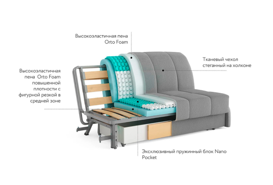 В основе дивана – высокий матрас, уникальный для такого вида трансформации. 7-зональный пружинный блок NanoPocket поддерживает позвоночник в анатомически правильном положении, способствует комфортному расслаблению.