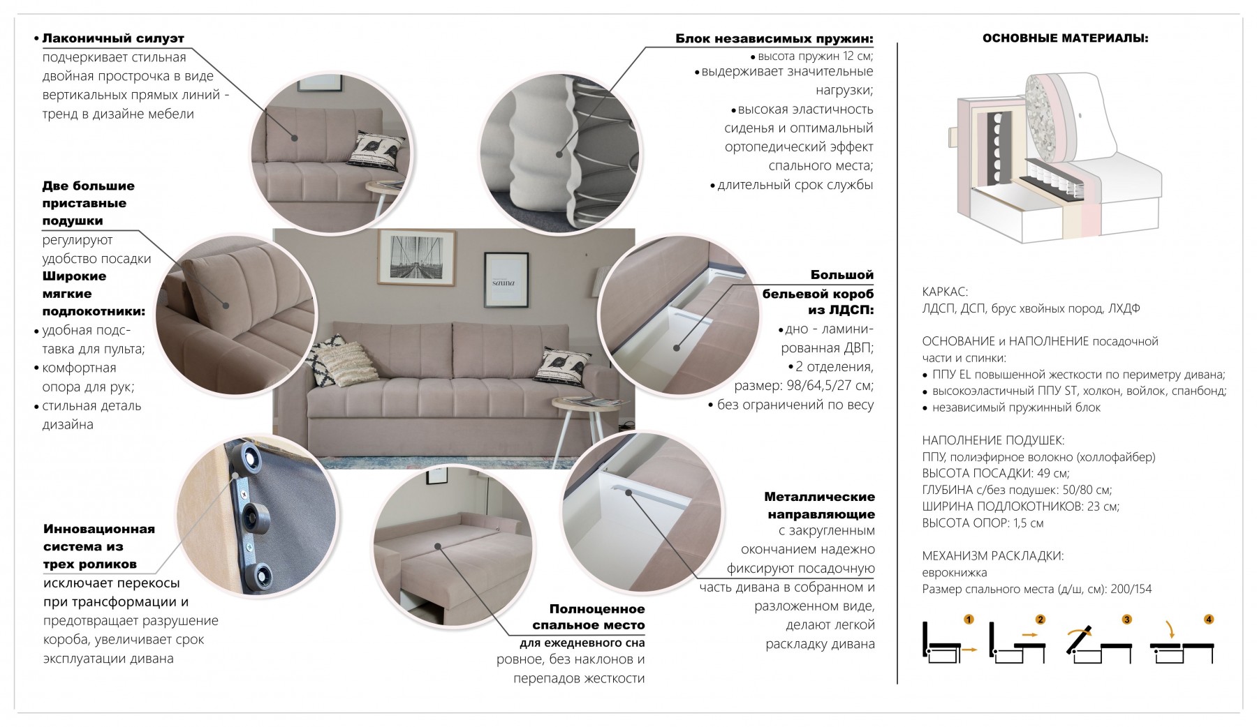 Спальное место: 1400х1900 мм. Независимый пружинный блок. Способ раскладки: Тик-так.