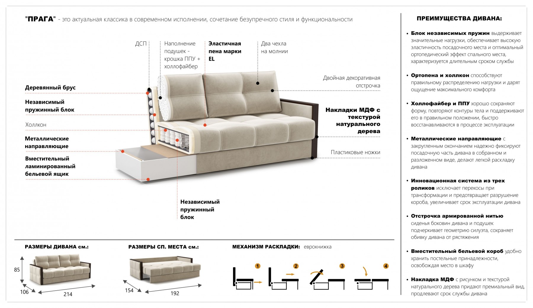 Спальное место: 1980х1560 +/-20мм. Механизм трансформации: еврокнига.