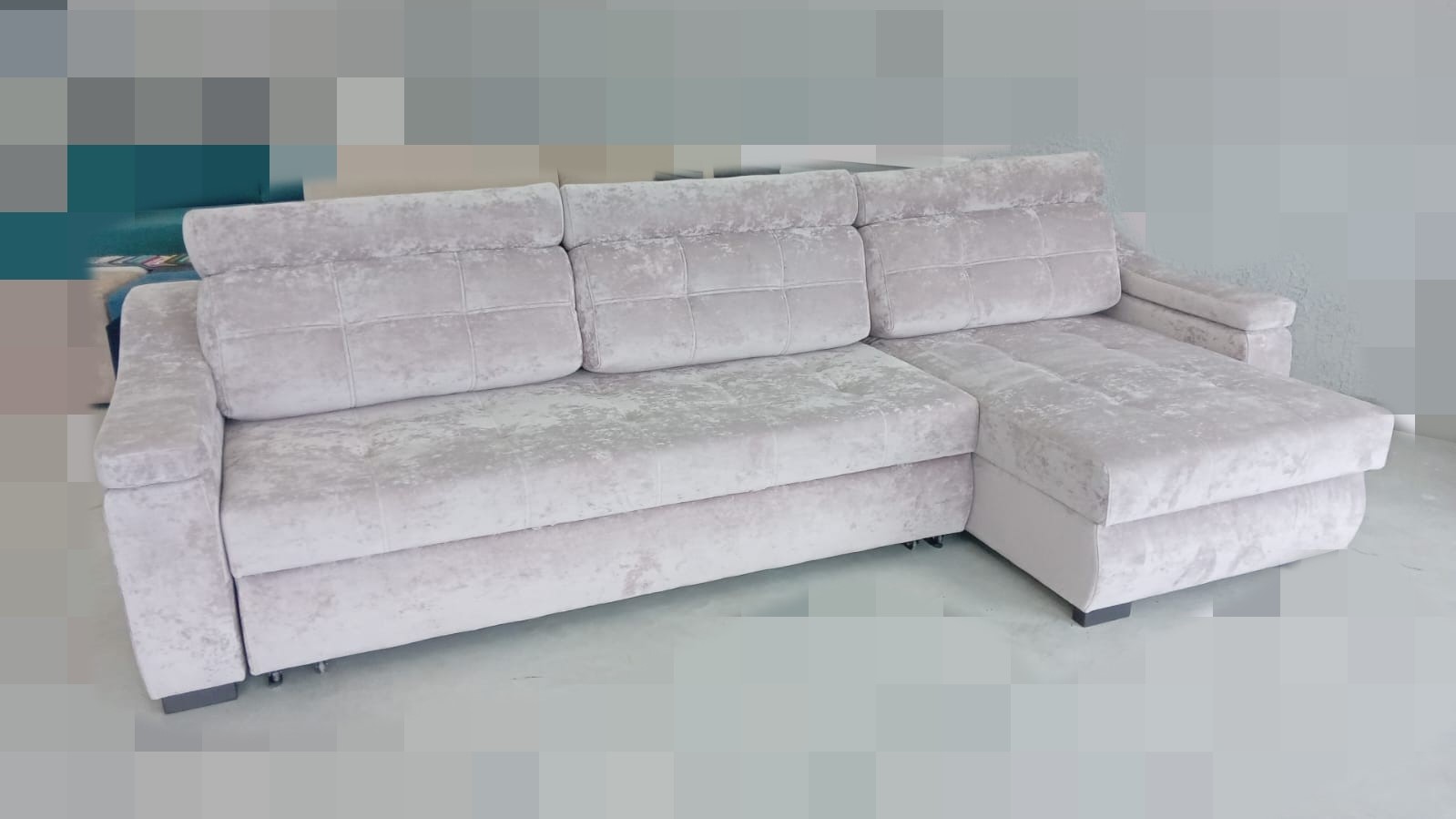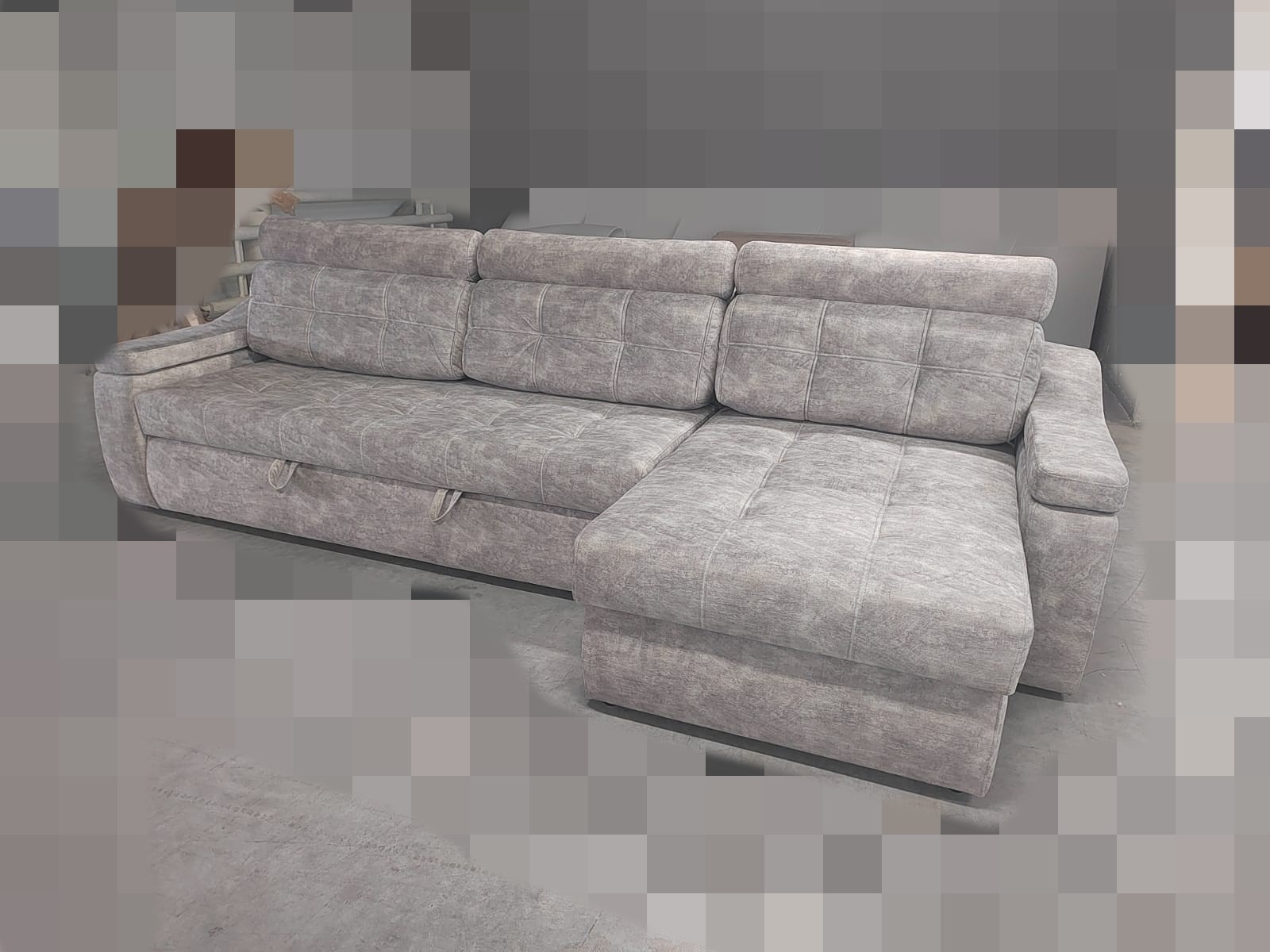 Большой угловой диван в бежевом цвете. Накладка на подлокотнике. Ящик для белья.