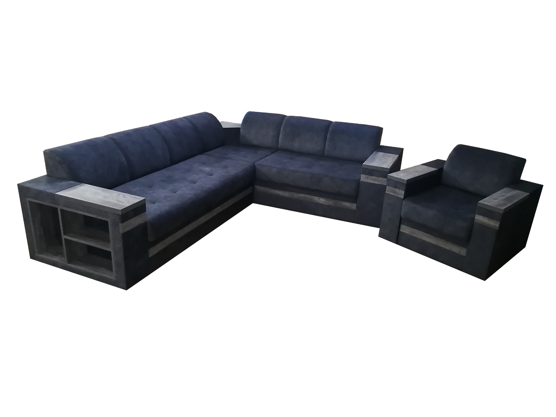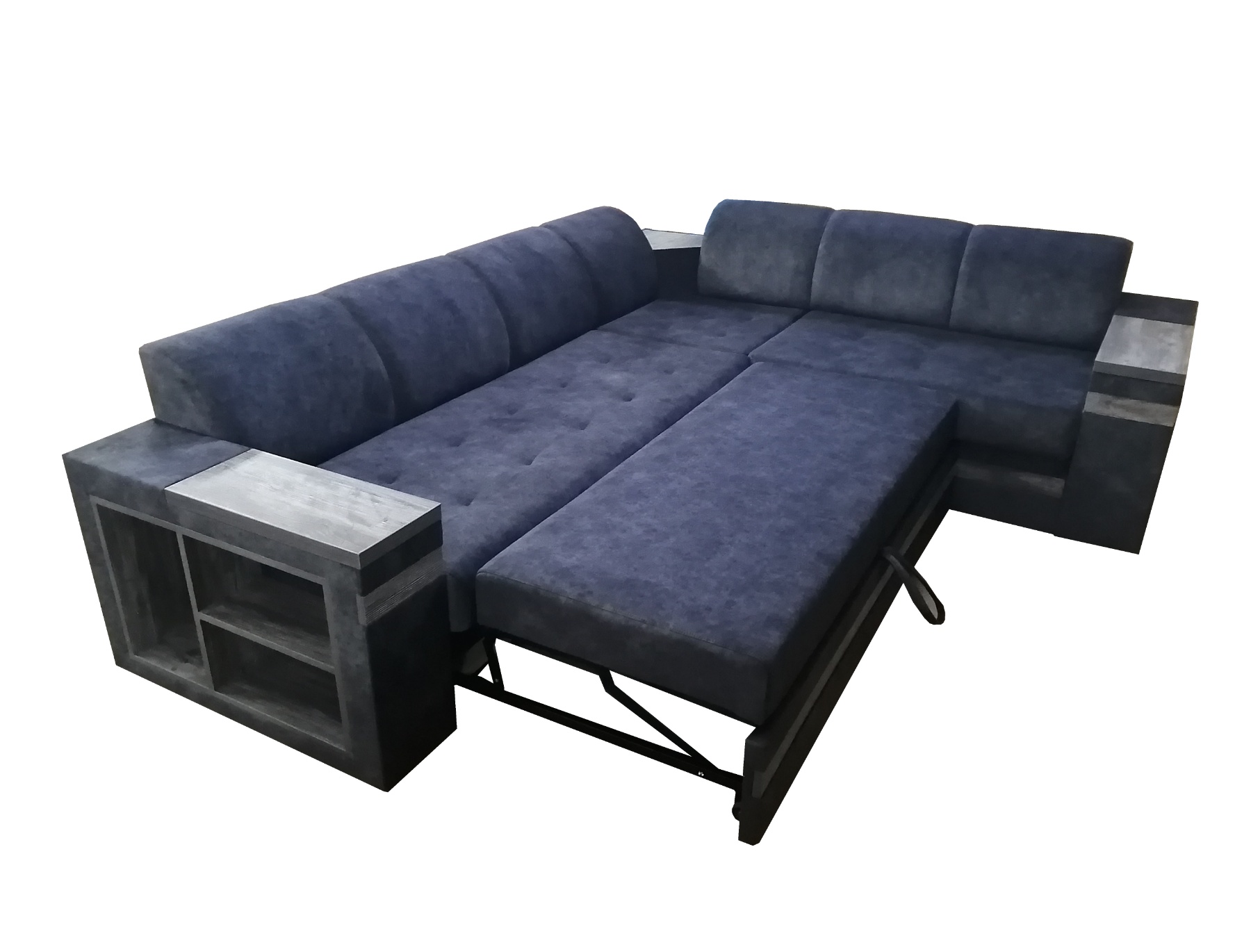 Современный стиль. Полки в боковинах и широкие подлокотники с деревянными вставками