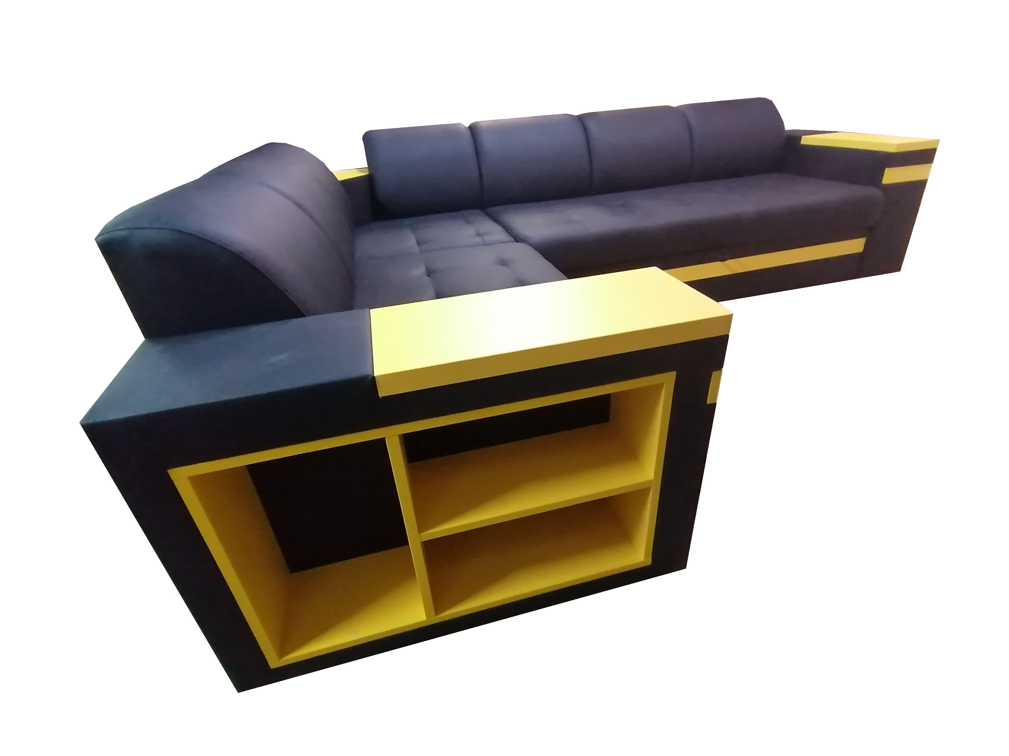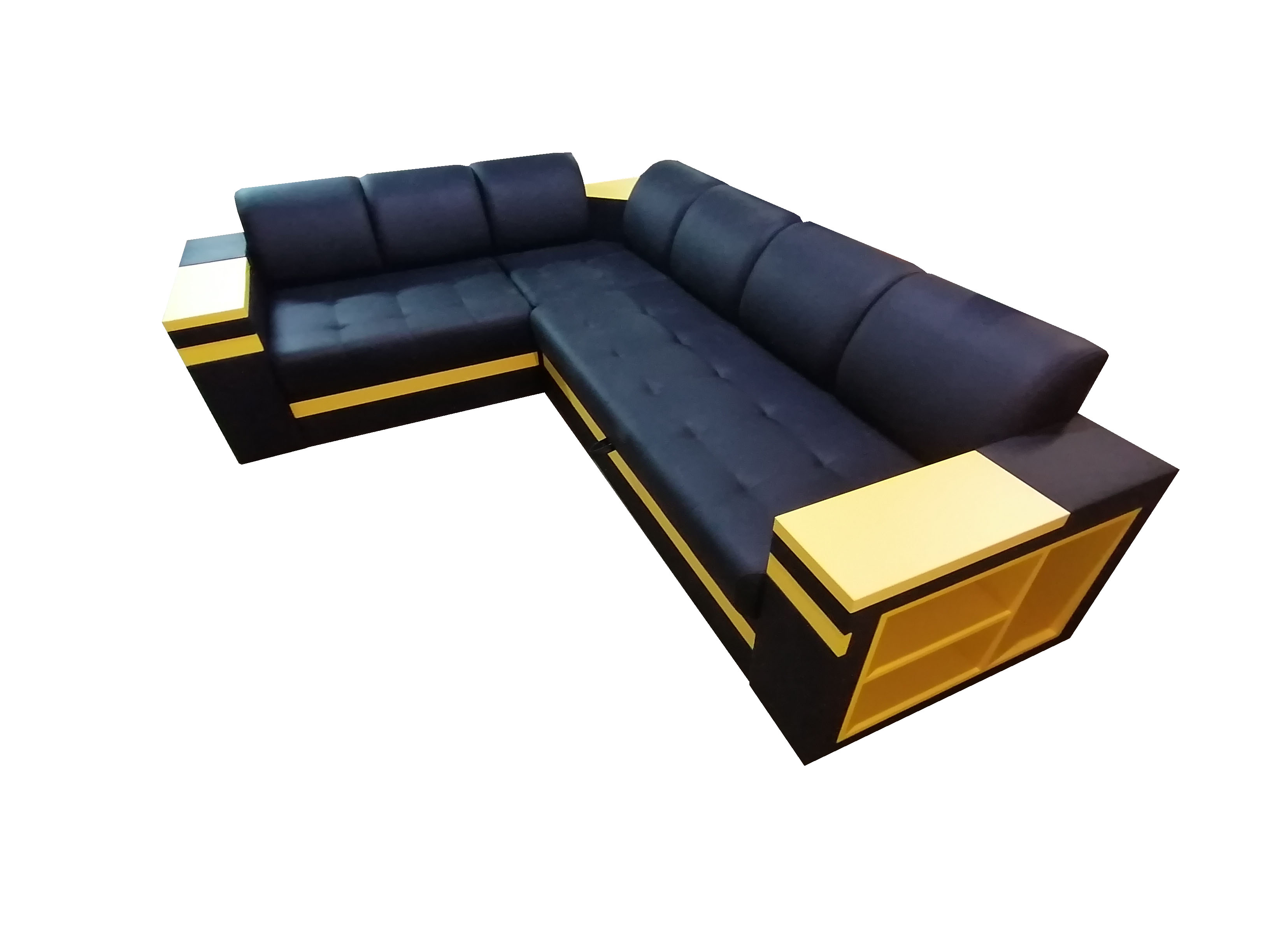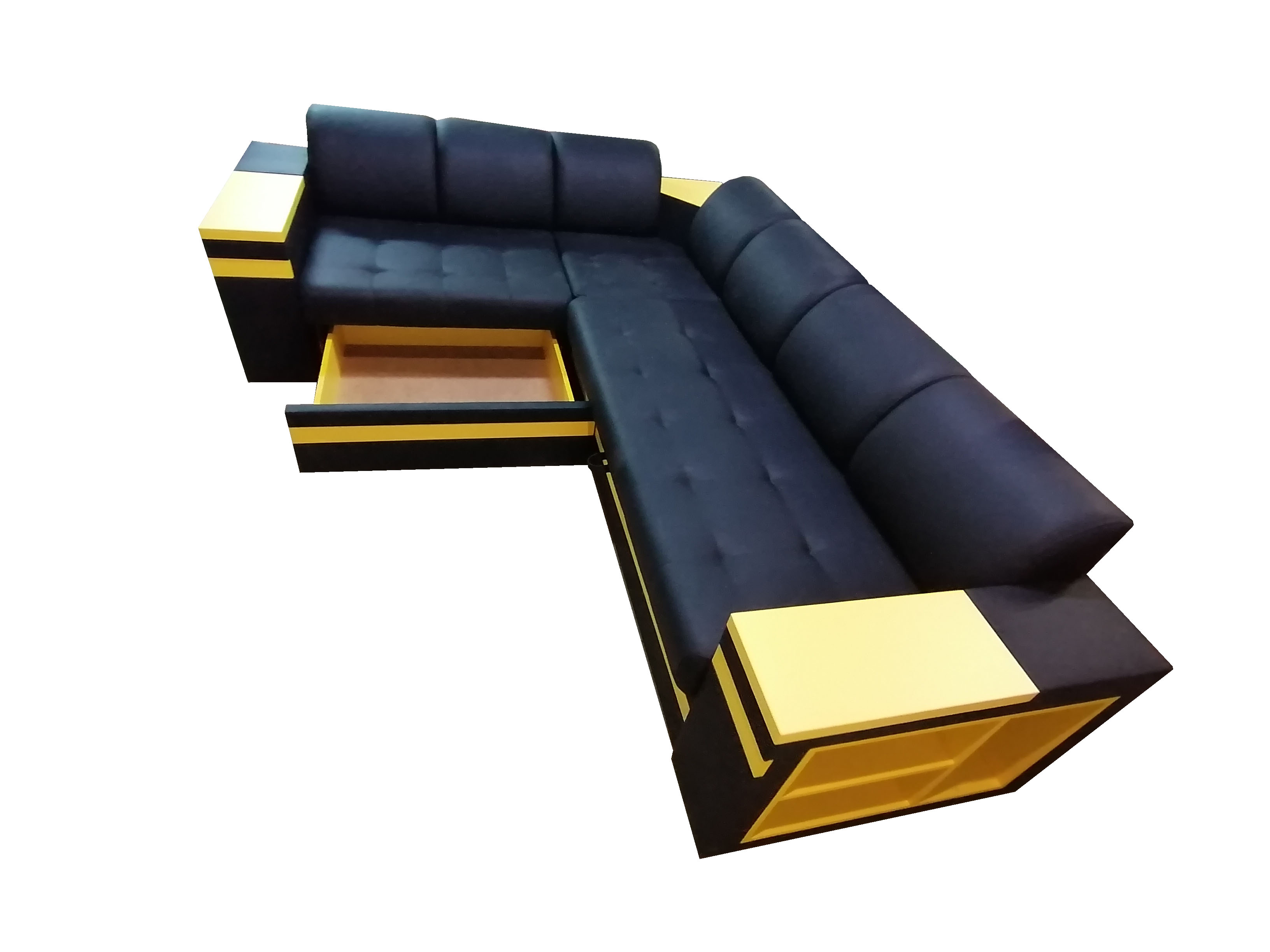 Стильный и функциональный угловой диван с полками в подлокотниках
