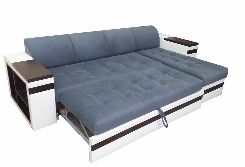 Стильный и функциональный угловой диван с полками в подлокотниках