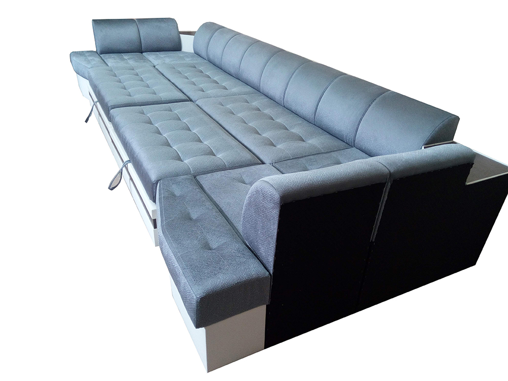 Очень вместительный и длинный диван «Престиж Long» прекрасно впишется в большие и просторные гостиные комнаты. Диван имеет п-образную конструкцию и раскладывается, за счет чего превращается в очень удобное и уютное спальное место. Обивка выполнена в сене-сером цвете и очень приятна на ощупь.
