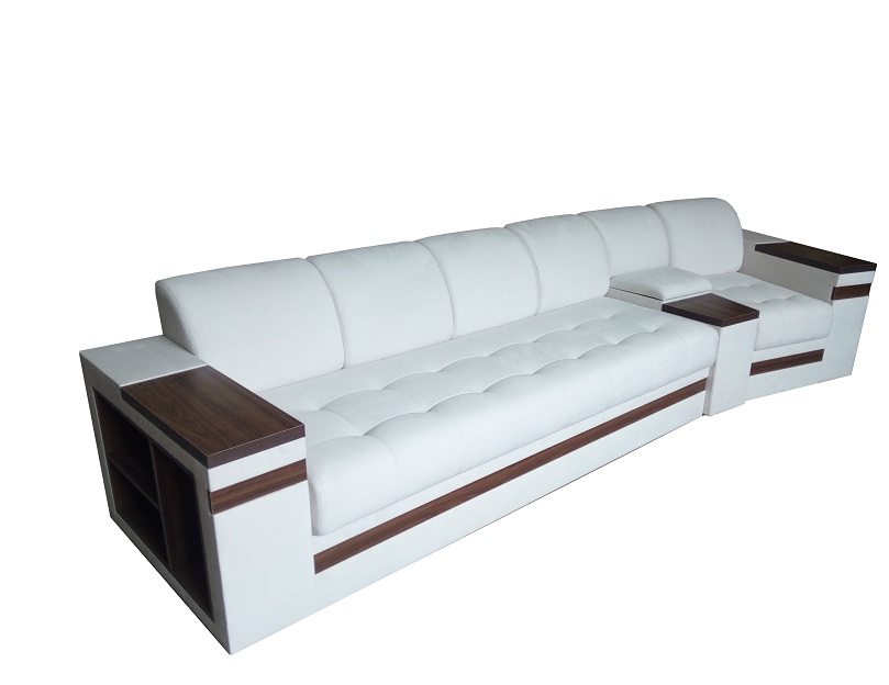 Диван «Престиж» имеет очень длинную конструкцию на четырех человек. Модель дивана раскладывается и образует очень большое и удобное спальное место. В качестве обивки выбрана светлая мебельная ткань с интересной стяжкой, напоминающей английскую. Боковины декорированы открытыми полочками для книг и элементов декора, широкие подлокотники дополнены деревянными вставками.