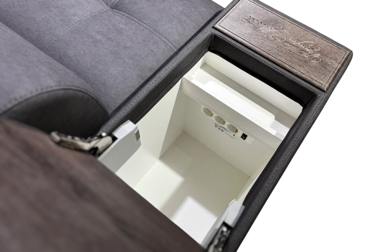 код 148144Габариты: 2900х1050 мм. Подлокотник с нишей и розетками. Регулируемые подголовники. Ткань Велюр.