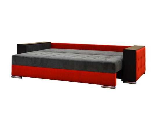 Яркий диван «Браво» с небольшой спинкой и деревянными подлокотниками обшит серой тканью с инкрустацией пуговицами. Наполнитель с НПБ придает мягкость и уют спальному месту. Стенки подлокотников выкрашены в красный цвет и декорированы пуговицами.