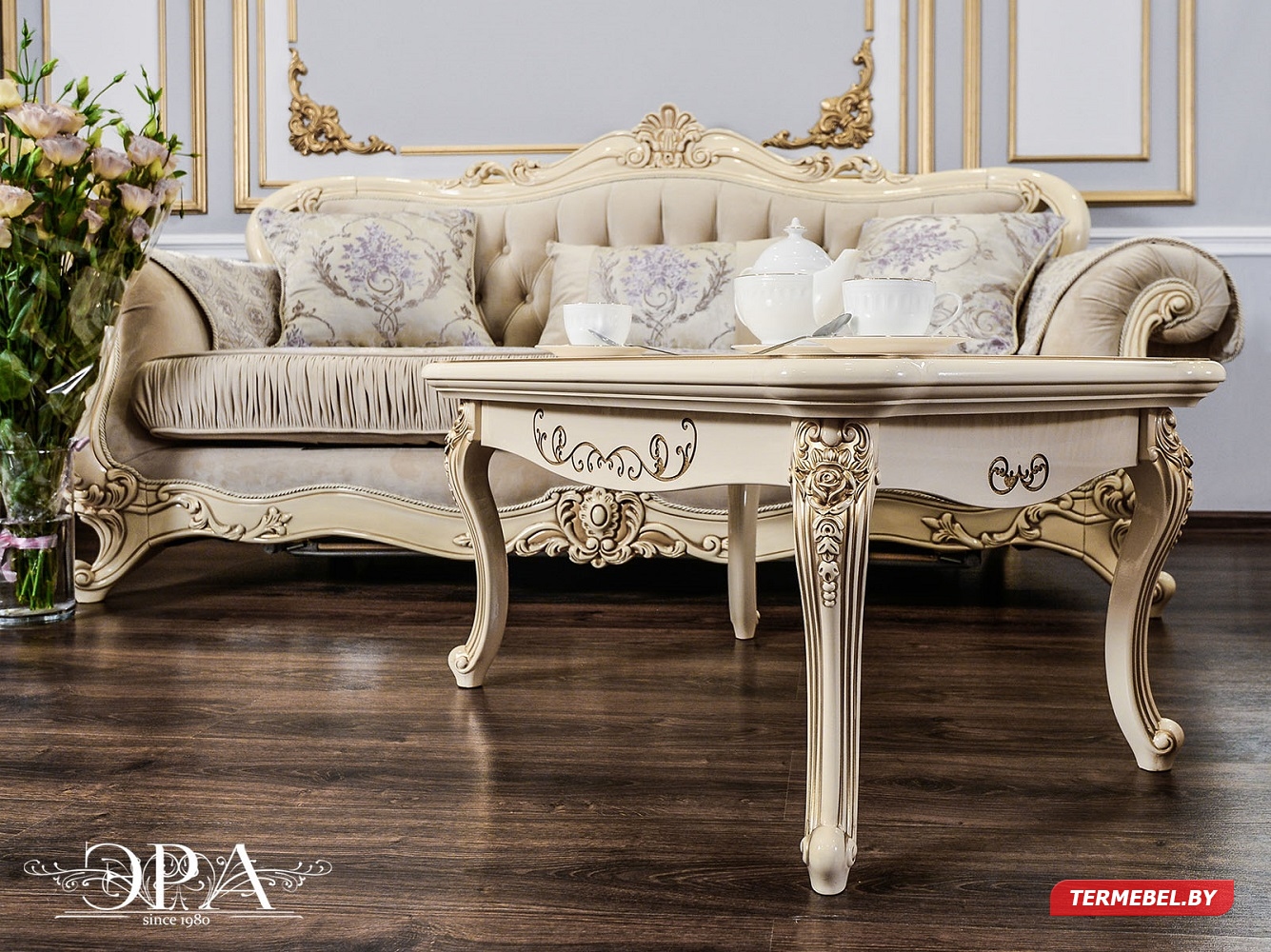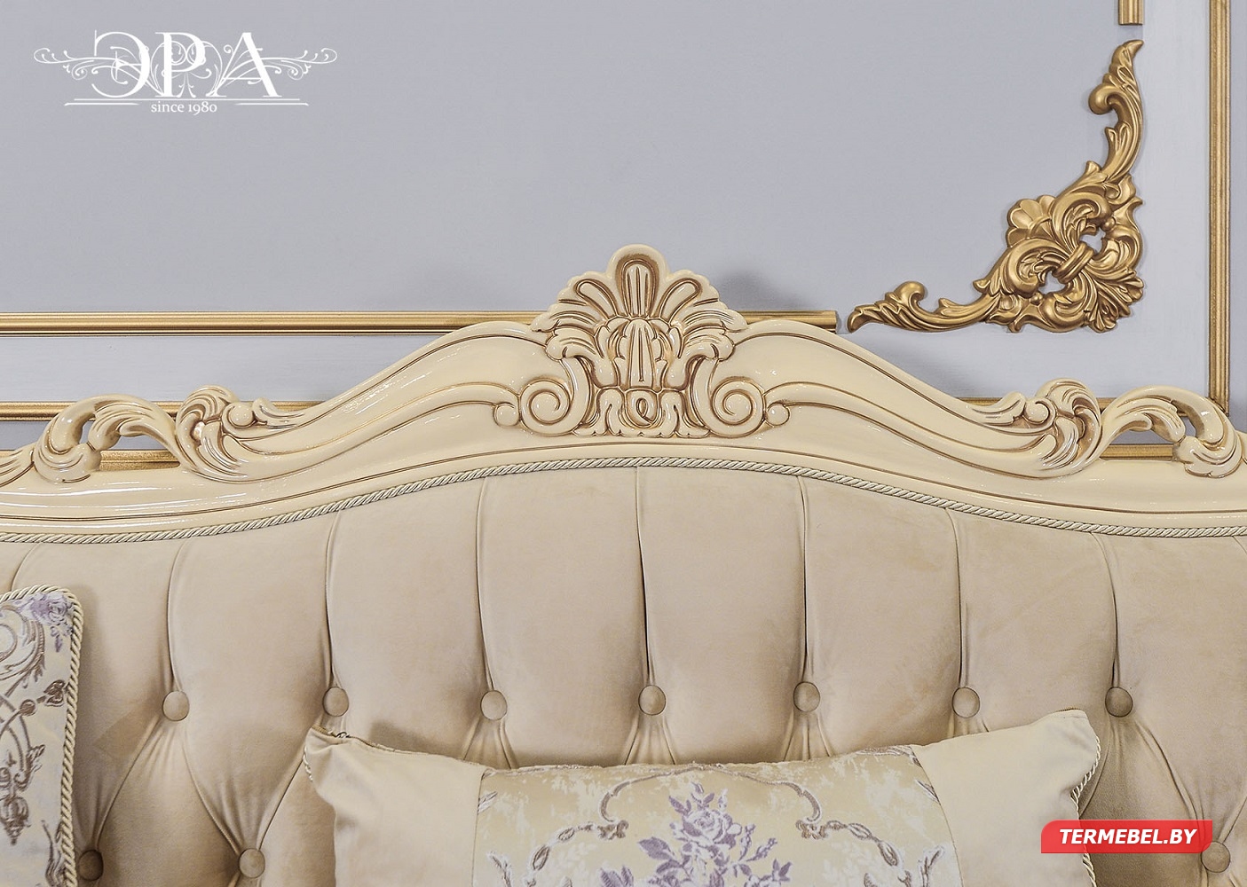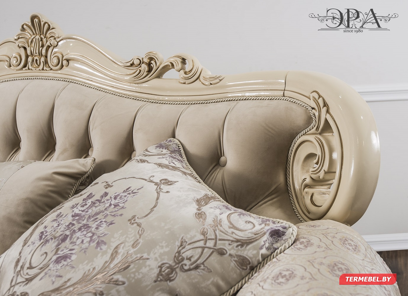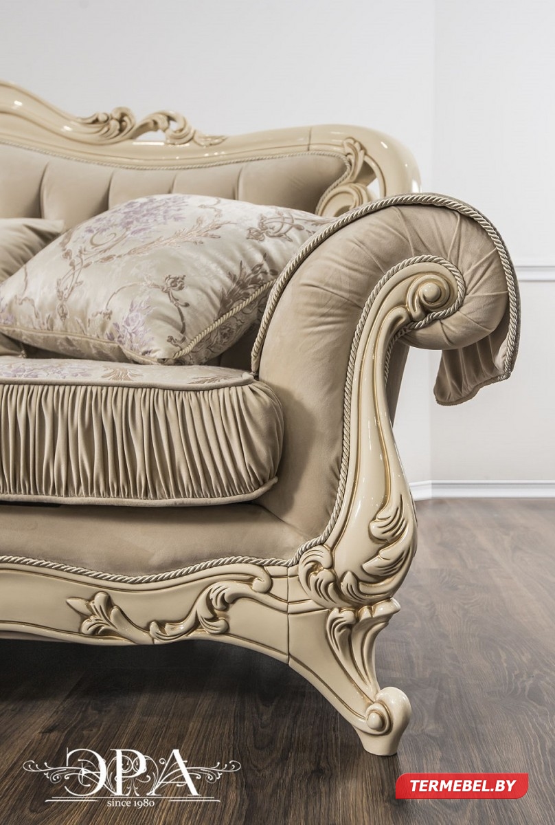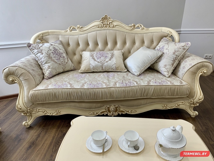 код 104380Резной декор кремового цвета. Размер дивана: 2430х950х1250 мм.