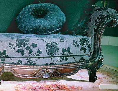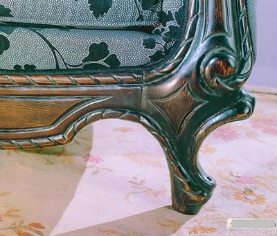 Обивочная ткань имеет изумрудный оттенок, на поверхности изображен цветочный рисунок.