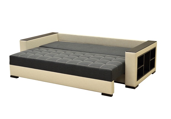 Диван прямой «Виктория» 2 выполнен в интересном дизайне c украшением спального места пуговицами. Торец дивана окрашен в элегантный молочный цвет. Подлокотники оснащены деревянной пластиной, предотвращающей их повреждение. Боковые стенки оснащены полками из качественного ламинированного ДСП.