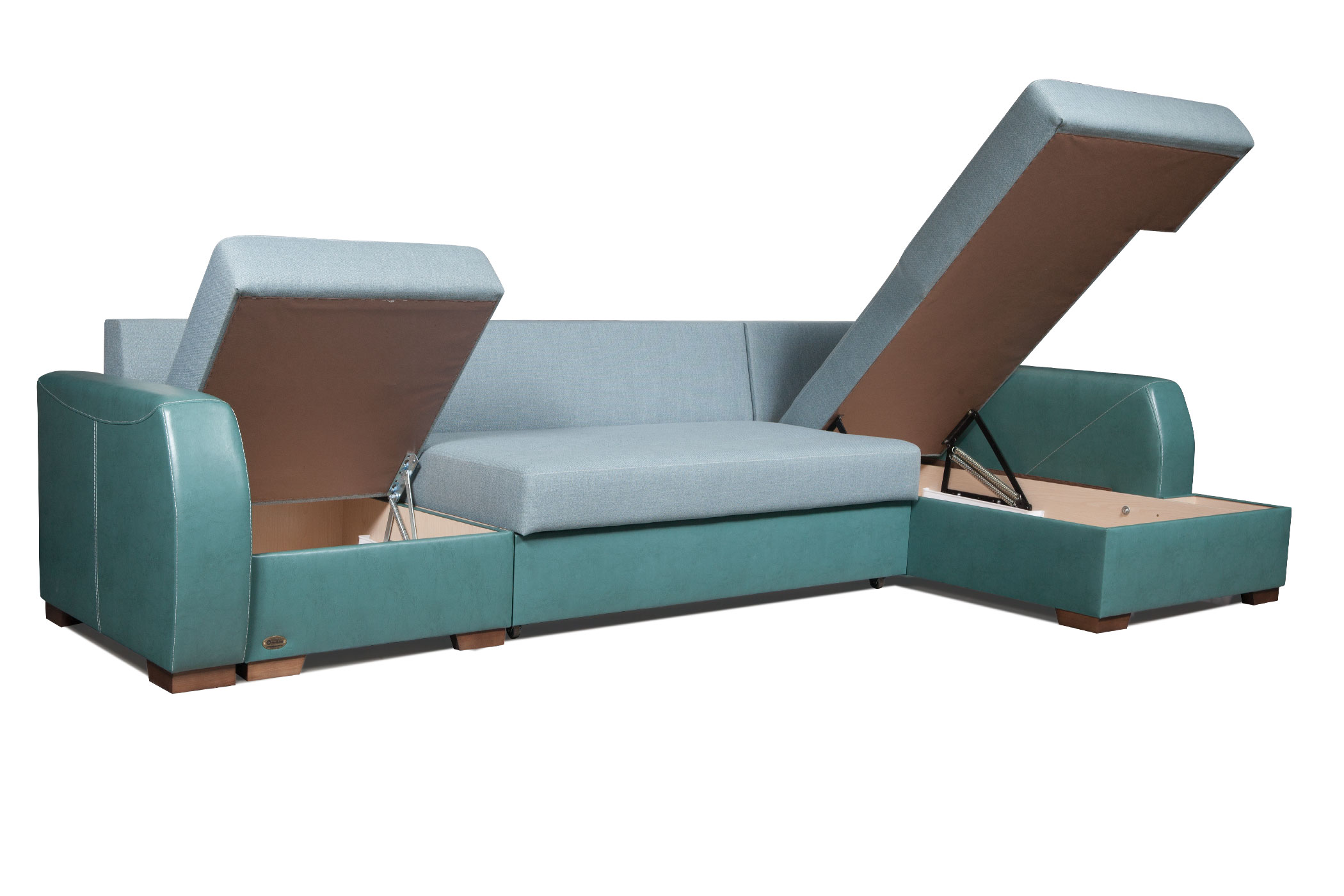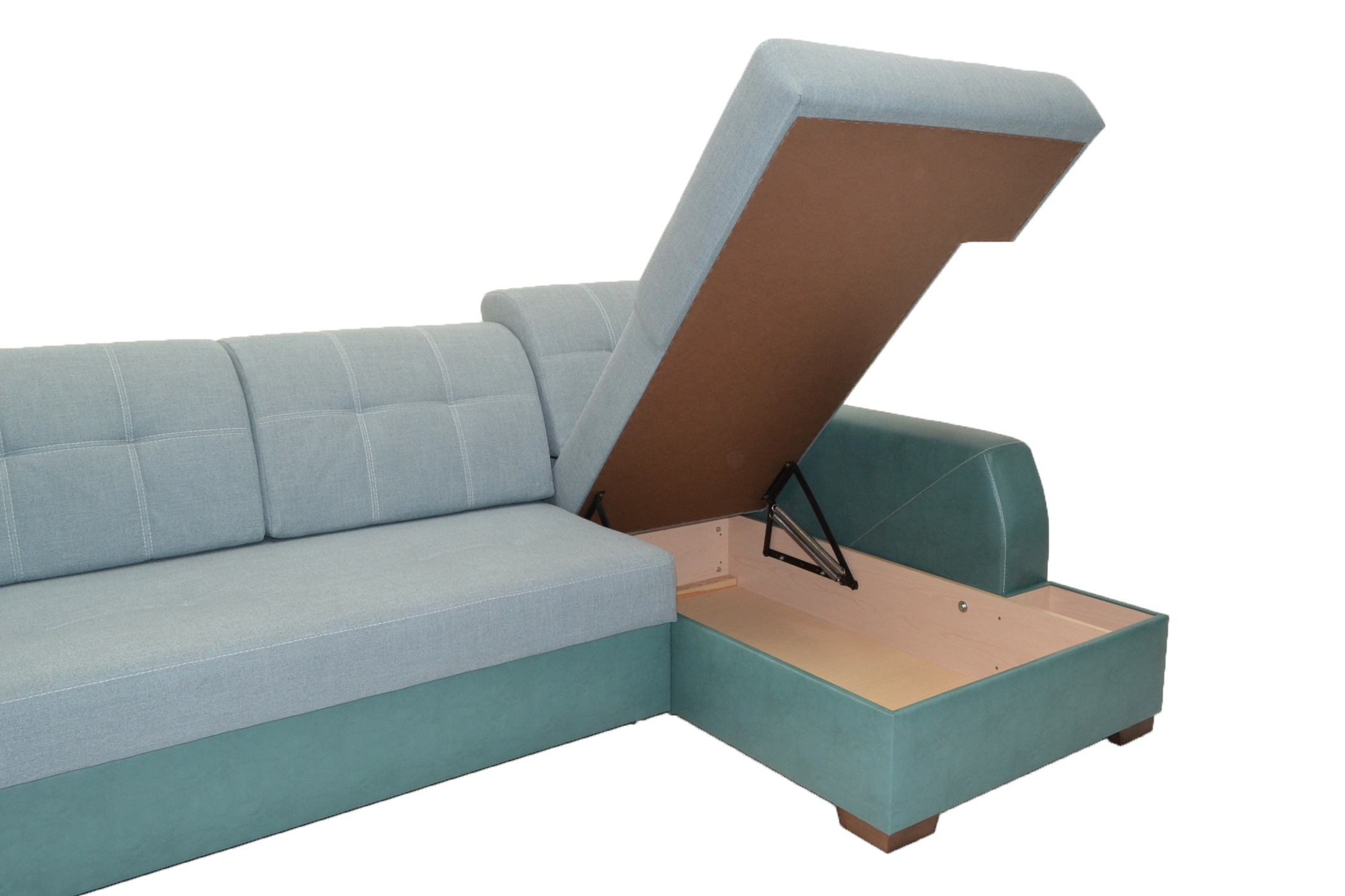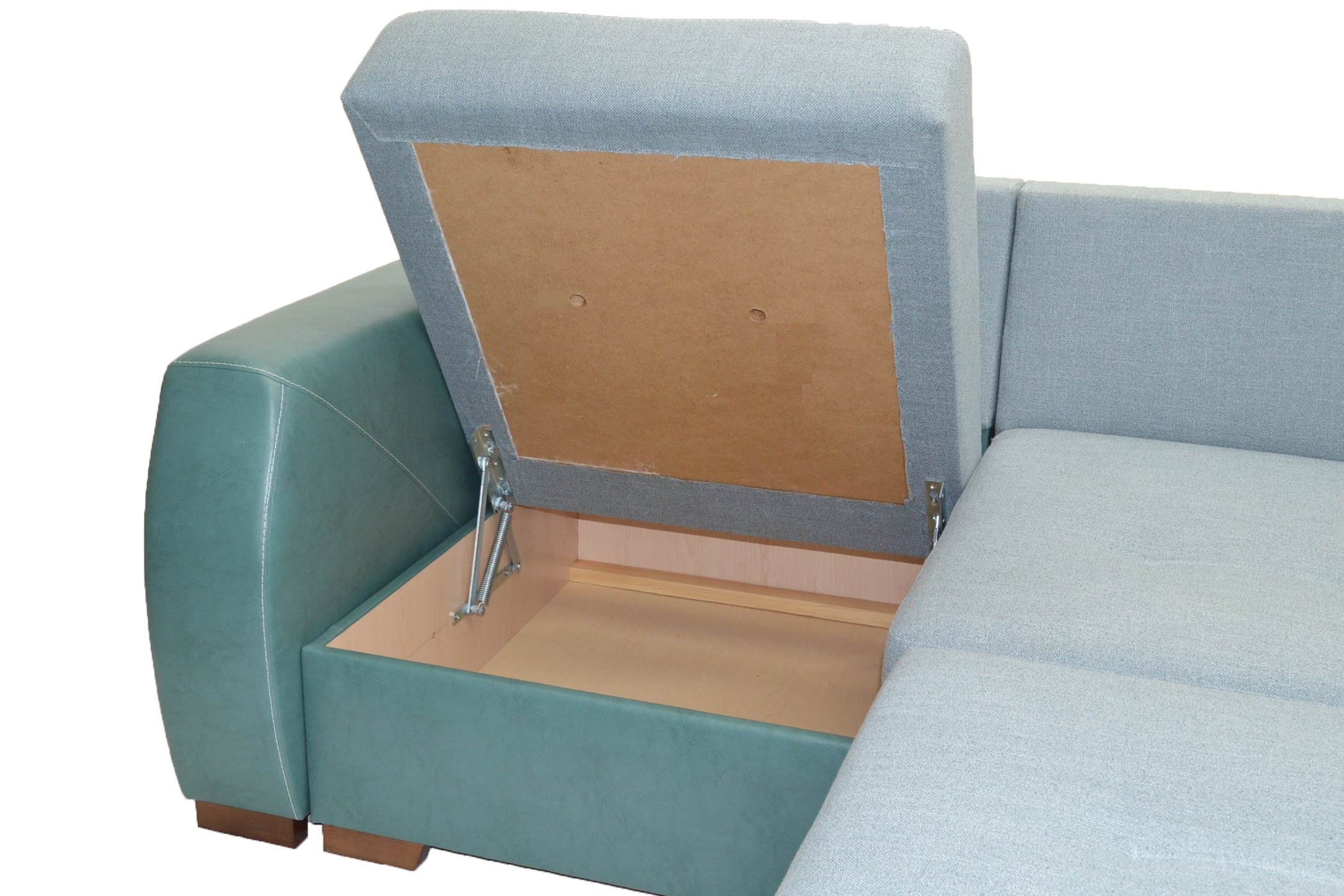 Диван оснащен легким механизмом раскладки и бельевым ящиком.