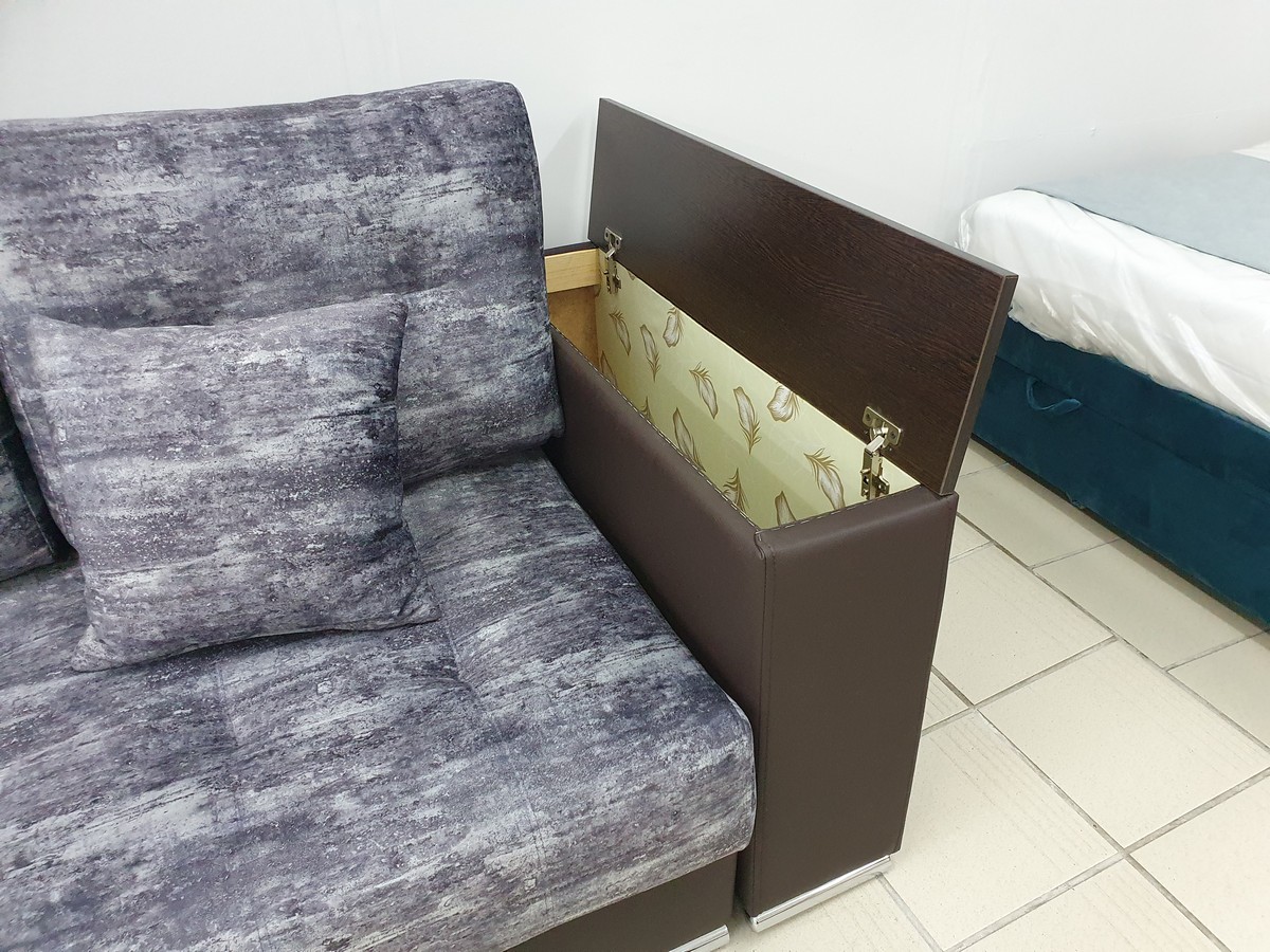 - Механизм трансформации - еврокнига. Каркас из хвойных пород дерева при добавлении фанеры и ДСП. Спинка и сиденье дивана на основе блока независимых пружин. Имеет вместительный бельевой короб. Может изготавливаться в ткани, экокоже (кожзаме).