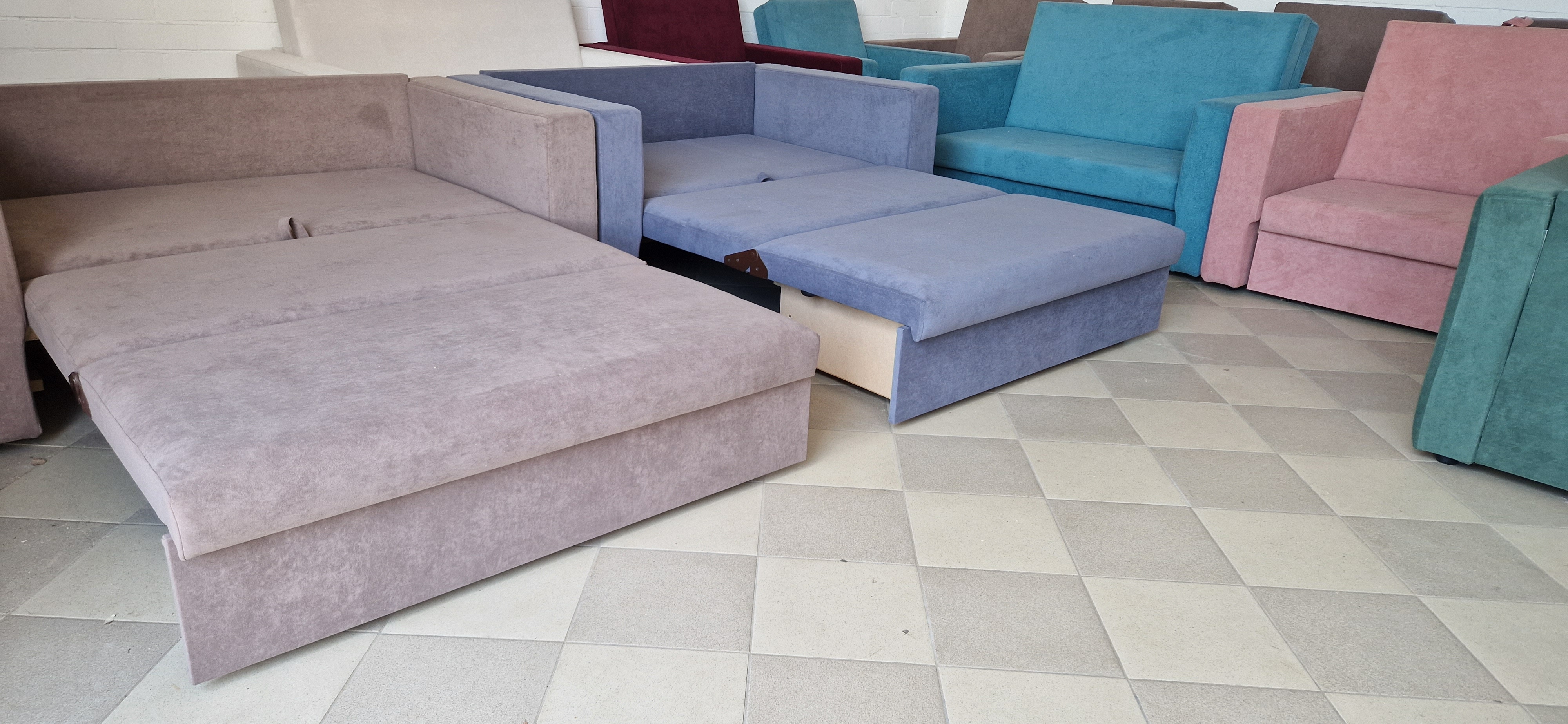 Современный диван со спальным местом и нишей для хранения.