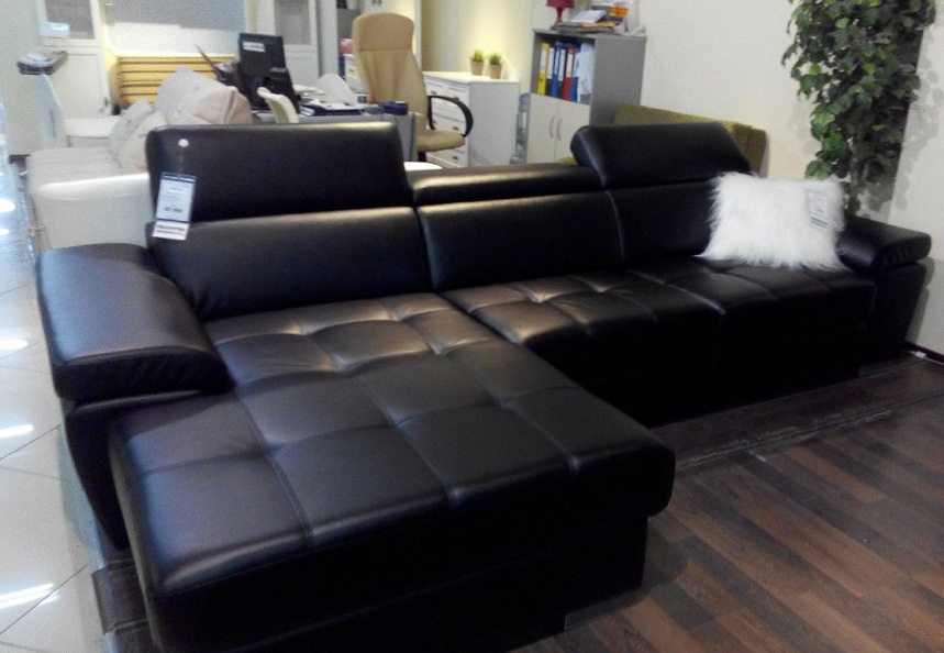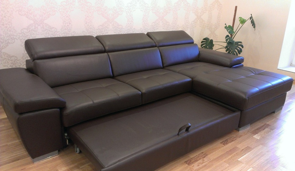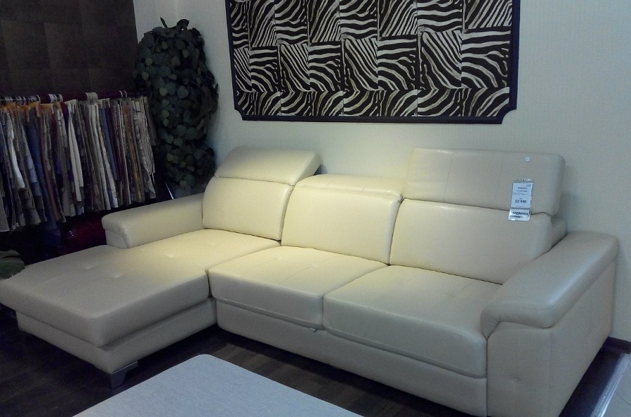 Классический угловой диван для гостиной в светлой кожаной обивке.