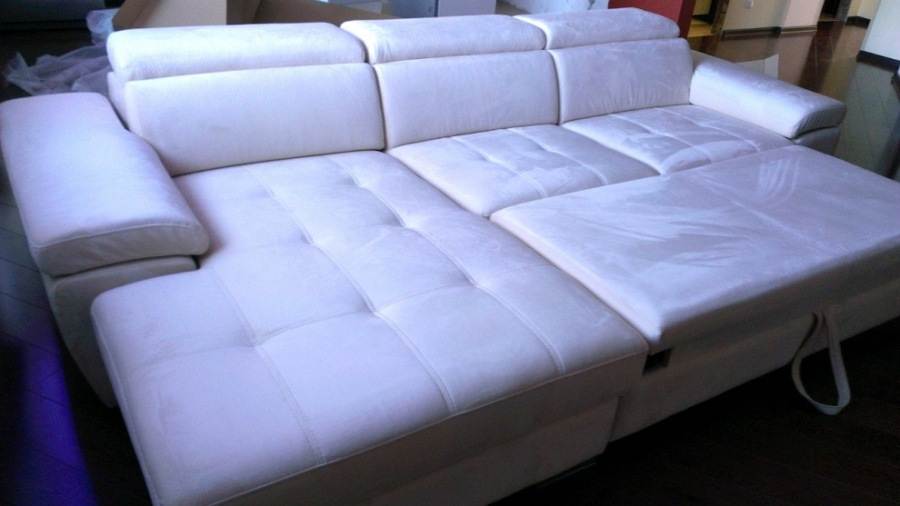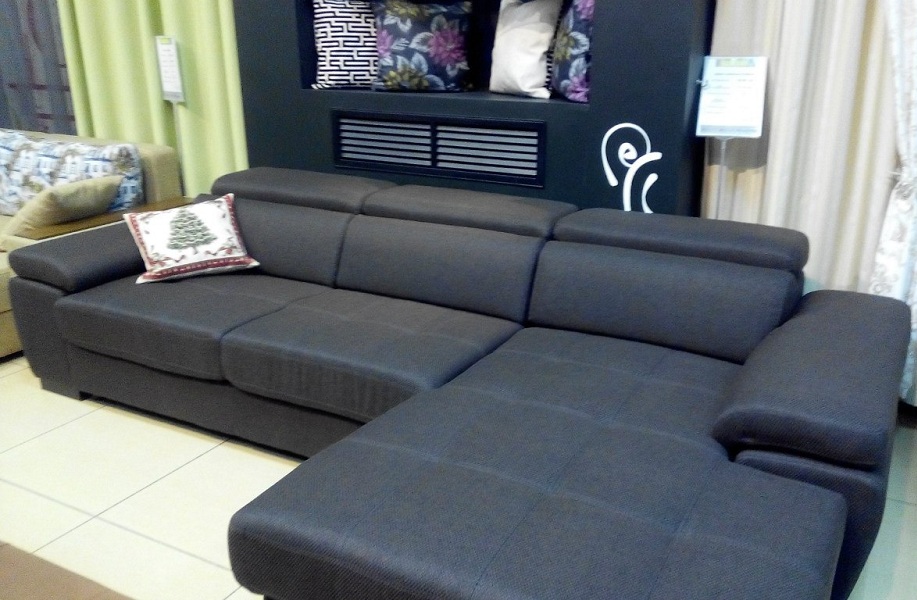 Стильный и функциональный угловой диван с полками в подлокотниках