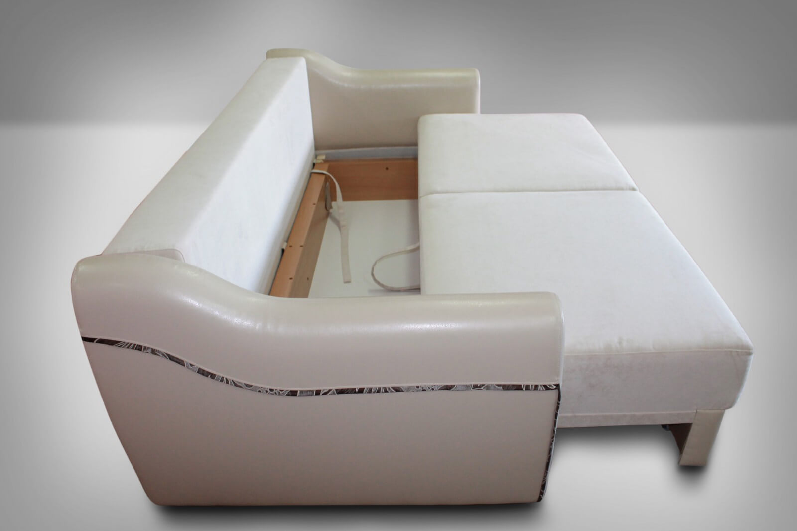 Ящики в подлокотниках и столик. Настил: ортопедические латы + ППУ.