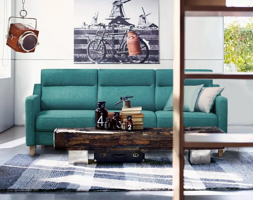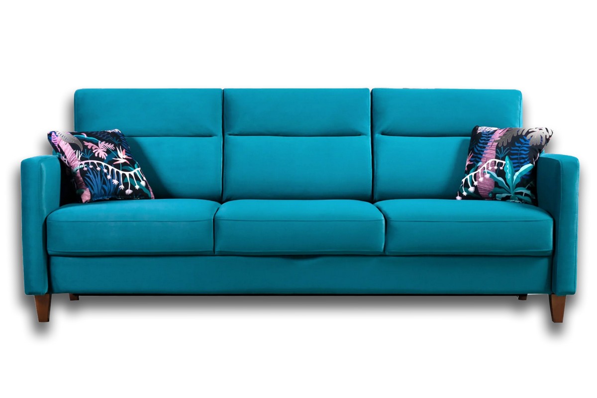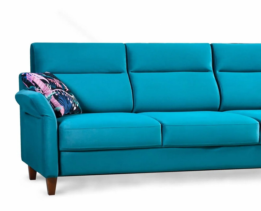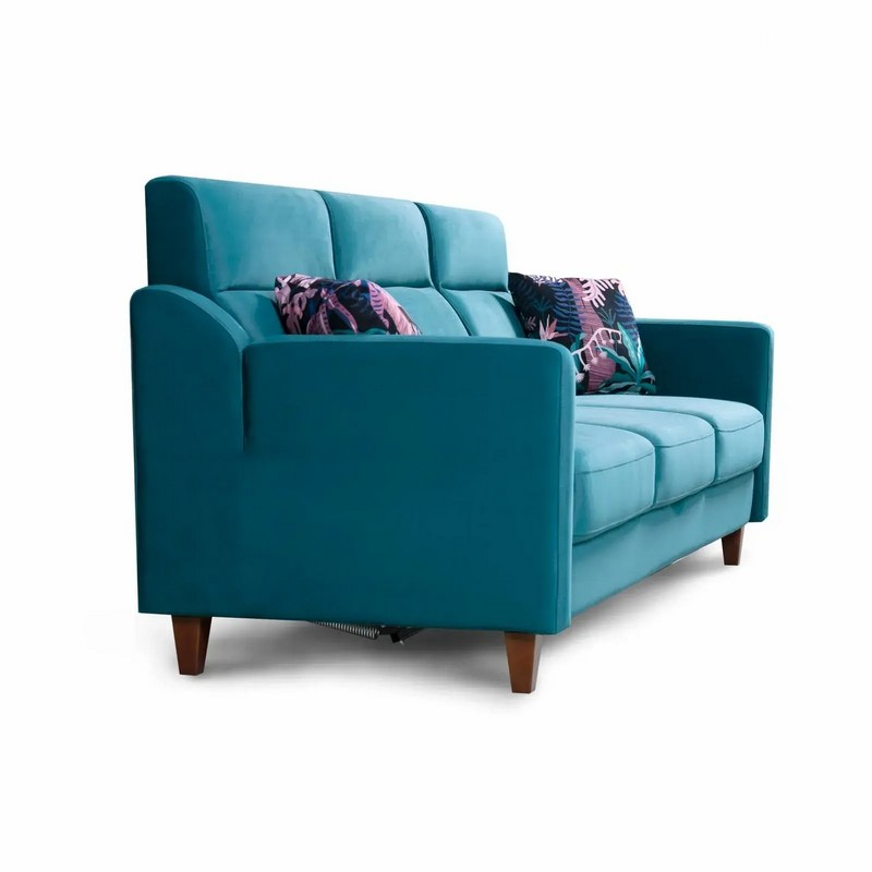 - Небольшие декоративные подушки в комплекте служат ярким акцентом и придают дивану выразительный вид. Задняя стенка дивана зашита основной тканью.