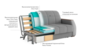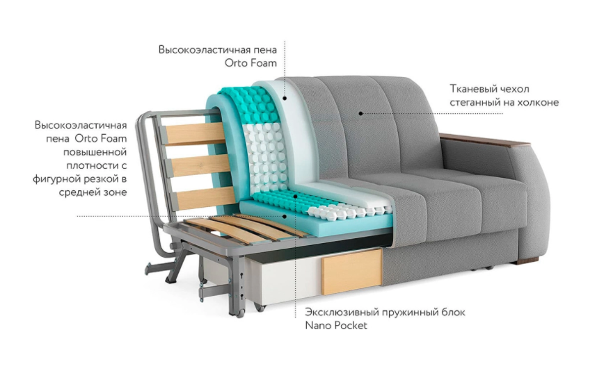 В основе дивана – высокий матрас, уникальный для такого вида трансформации. 7-зональный пружинный блок NanoPocket (блок независимых пружин высотой 2,5 см) поддерживает позвоночник в анатомически правильном положении, способствует комфортному расслаблению.