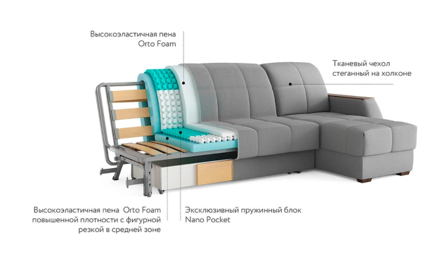 В основе дивана – высокий матрас, уникальный для такого вида трансформации. 7-зональный пружинный блок NanoPocket (блок независимых пружин высотой 2,5 см) поддерживает позвоночник в анатомически правильном положении, способствует комфортному расслаблению.