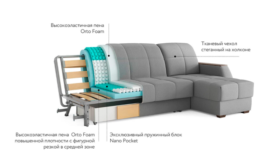 В основе дивана – высокий матрас, уникальный для такого вида трансформации. 7-зональный пружинный блок NanoPocket (блок независимых пружин высотой 2,5 см) поддерживает позвоночник в анатомически правильном положении, способствует комфортному расслаблению.