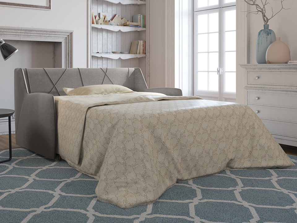- Лаконичный кант, которым декорированы подлокотники и спинка-изголовье, вносит изюминку в оформление.