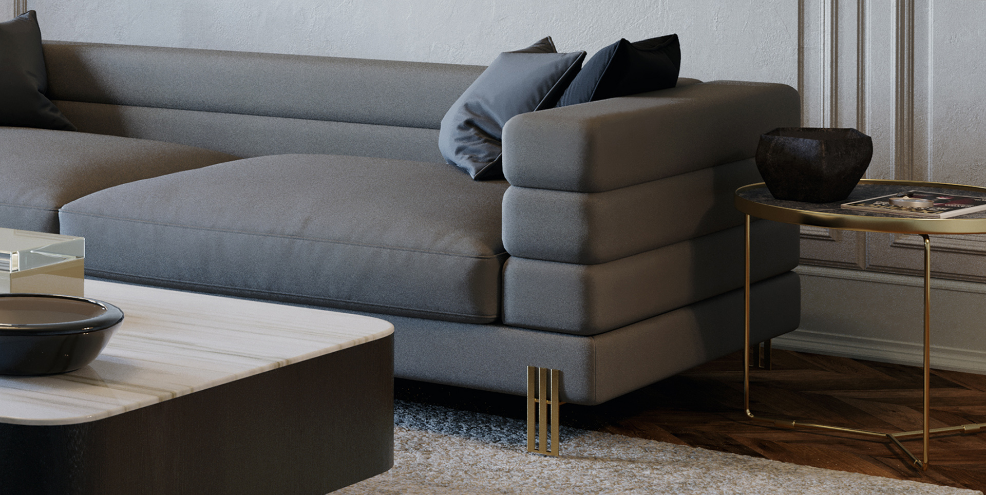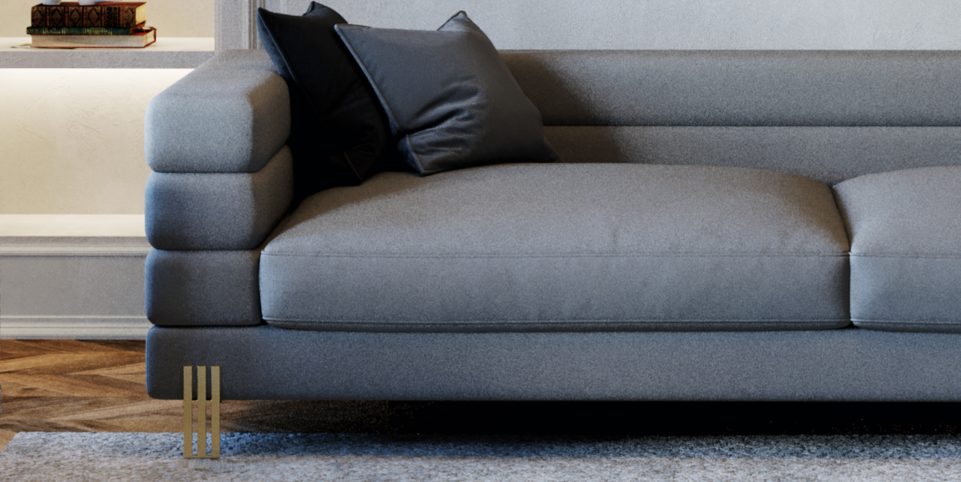 Стильная и необычная модель дивана, которая станет украшением современного интерьера. Боковины как бы являются продолжением спинки, создавая эффект цельной фигурной конструкции. Эффект цельности усилен глубокими горизонтальными утяжками по всему периметру. Мотив параллельных линий поддерживают Ш-образные металлические опоры, выполненные в цвете «золото».