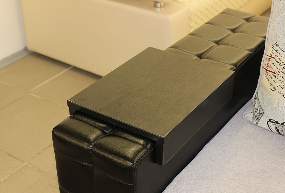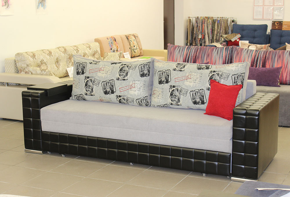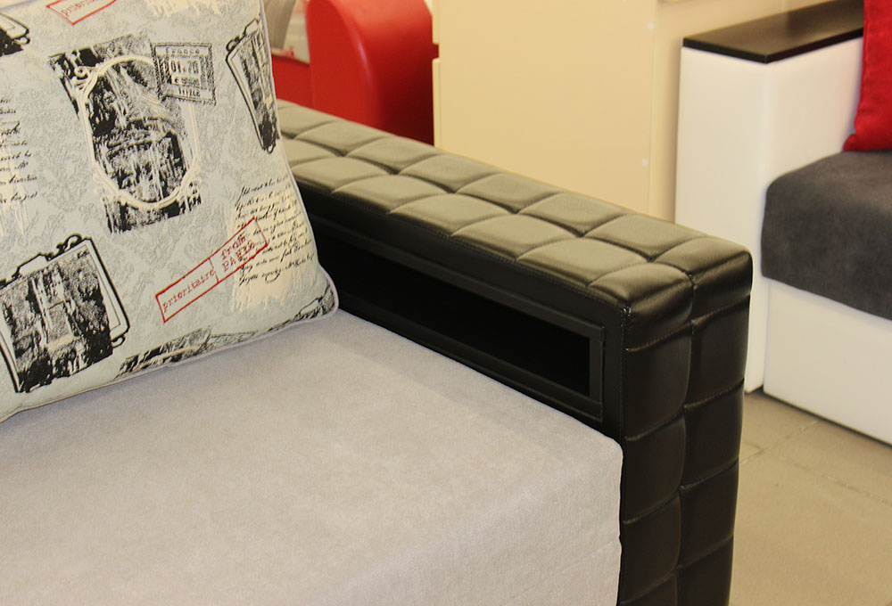 Представленный вариант дивана «Талин-Люкс» выполнен в черном цвете. Отличительной черной данной модели являются функциональные подлокотники с жесткими вставками для посуды и вместительными нишами для хранения мелких вещей.