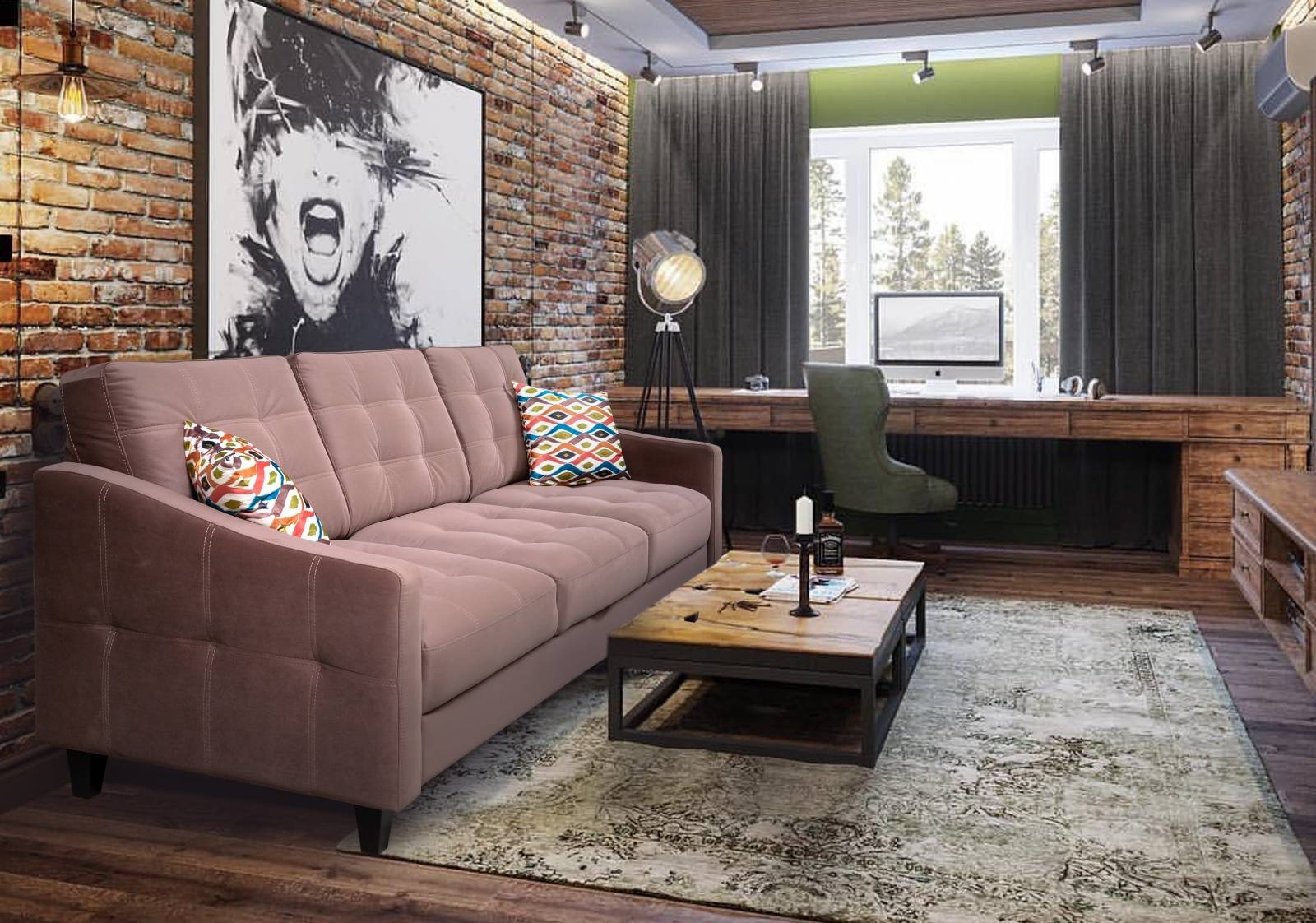 Линейный диван «Тофи» сделан в стильном современном дизайне. Его обивка выполнена в пудровом цвете и декорирована легкой стяжкой. Две яркие подушки с узорами небольших размеров.