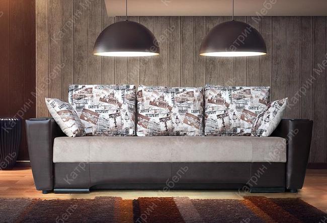 Обивка представлена в комбинированном цвете коричневых тонов. Три подушки с принтом декорируют мебель. Они идут в комплекте с ней.