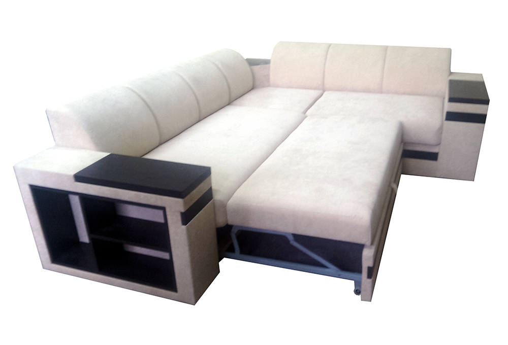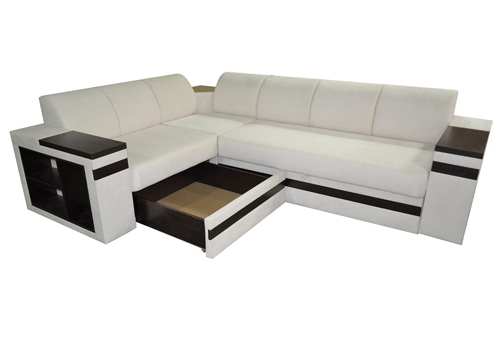 Внутри имеется встроенный короб для белья. Диван оборудован механизмом трансформации «Дельфин», что позволяет с легкостью преобразовать данную модель в просторное спальное место. В подлокотники встроены деревянные полки. Наполнение – независимый пружинный блок.
