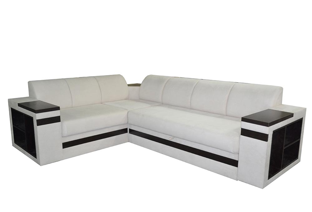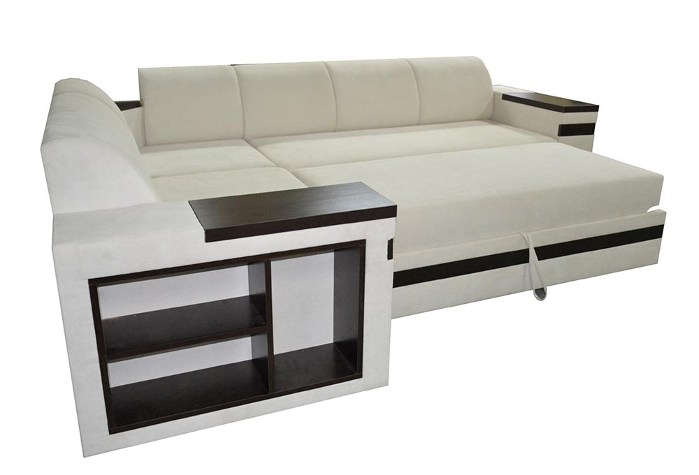Полки в боковинах и твердые подлокотники с деревянными вставками. Современный стиль.