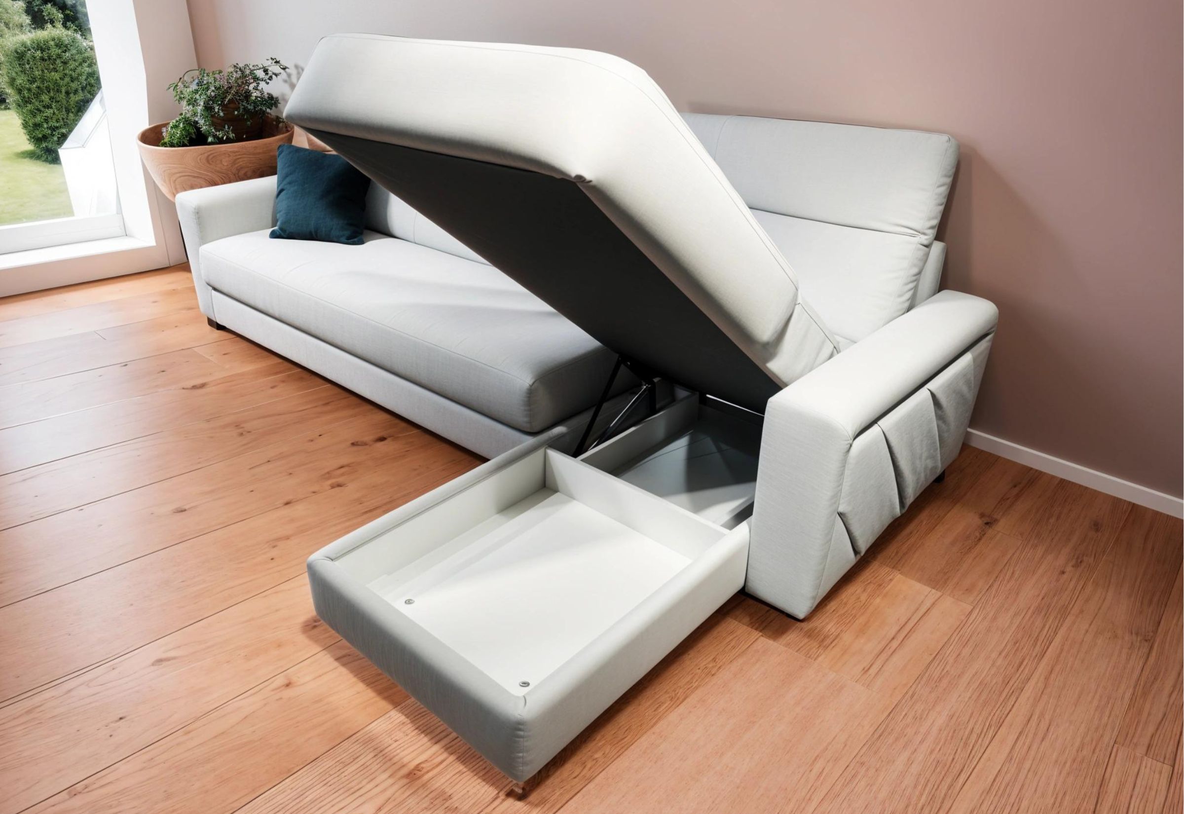Прямой светлый диван с кожаным основанием. Множество вариантов цвета. Ящик для хранения.